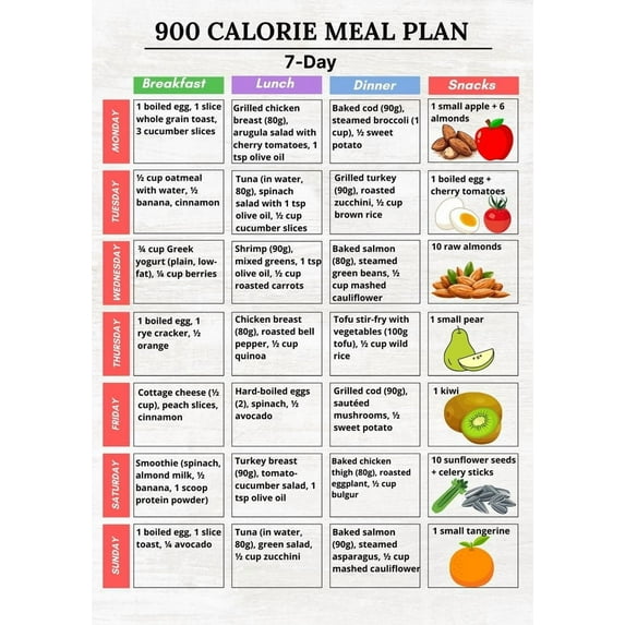 900 Calorie Meal Plan 7 Day Printable Menu Grocery List Poster