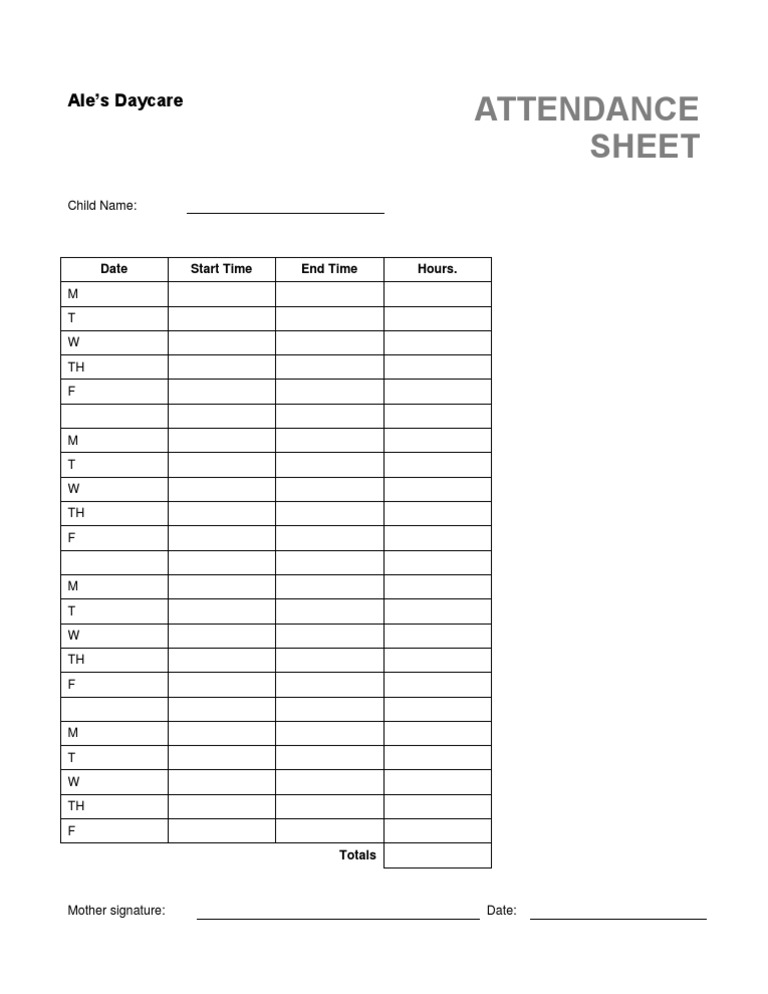 Daycare Attendance Sheet PDF