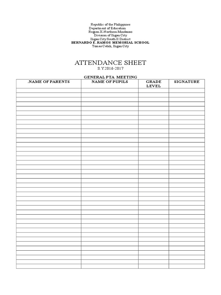 Attendance Sheet: General Pta Meeting Name of Parents Name of Pupils