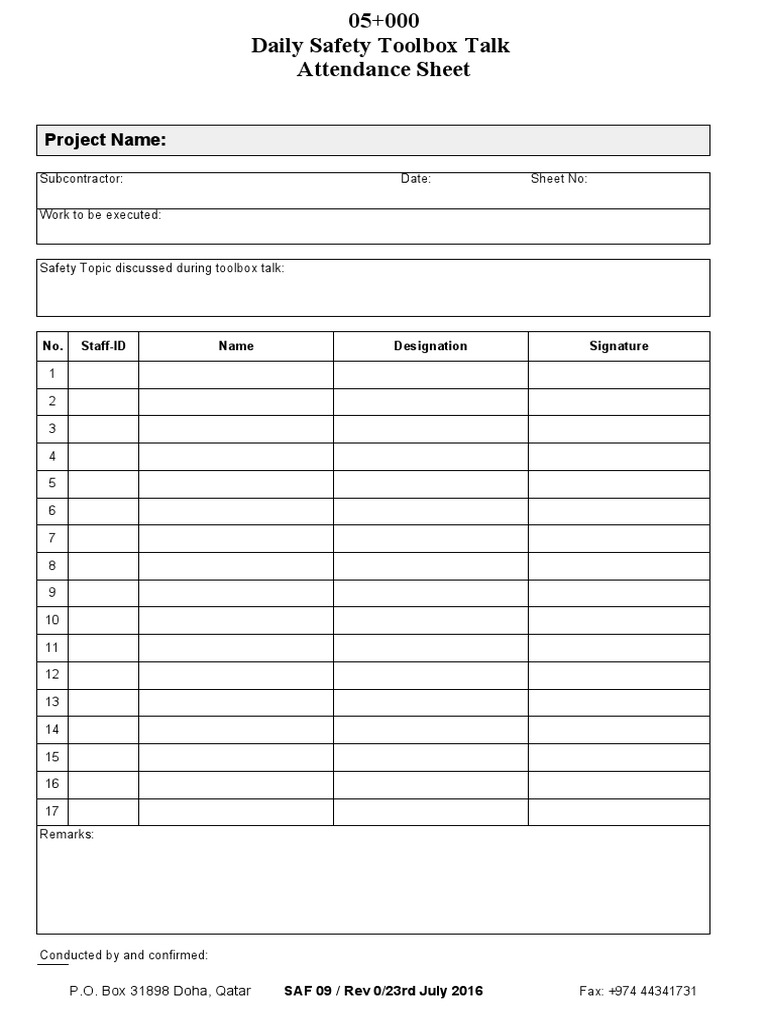 Daily Safety Toolbox Talk Attendance Sheet PDF
