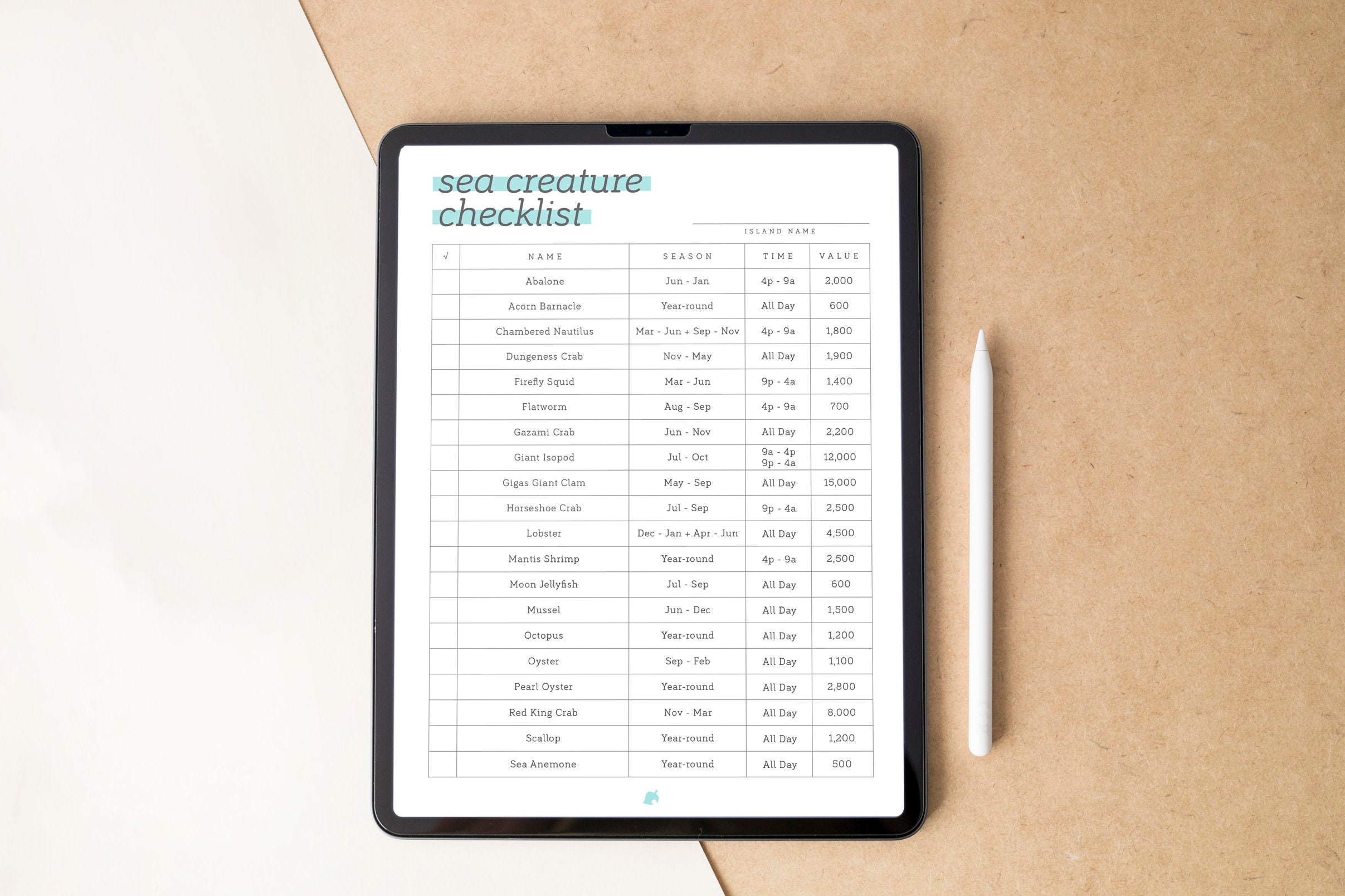 ACNH Sea Creatures Checklist Catch Guide Tracker Modern Animal Crossing