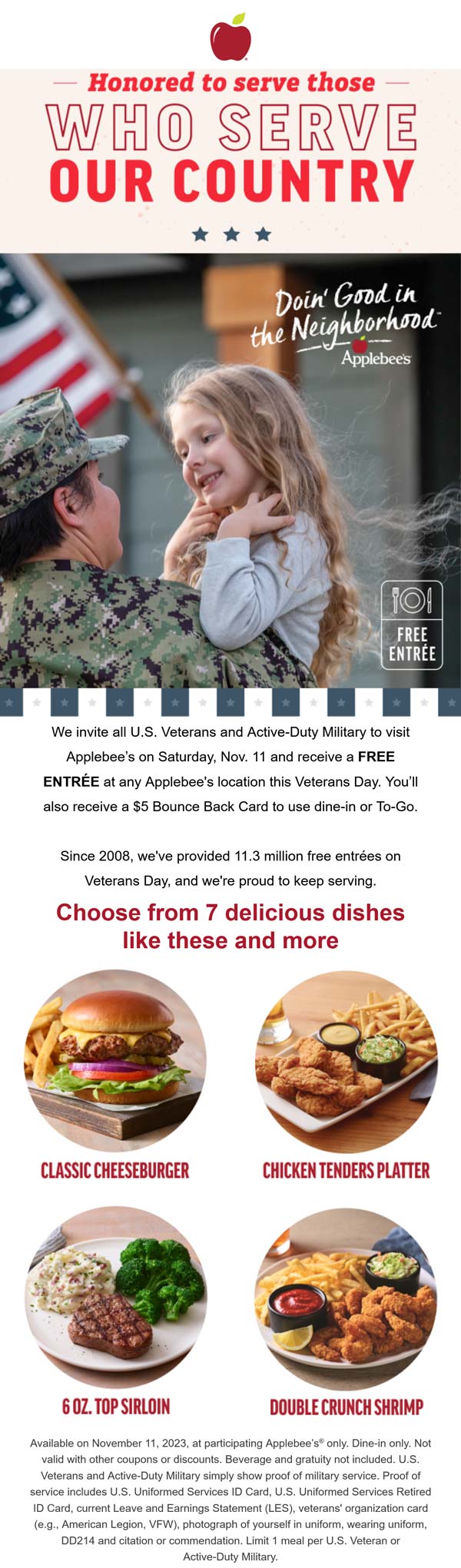 Veterans active enjoy a free entree Saturday at Applebees Applebees