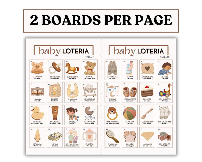 Neutral Baby Shower Loteria Game Spanish English 50 Boards 54