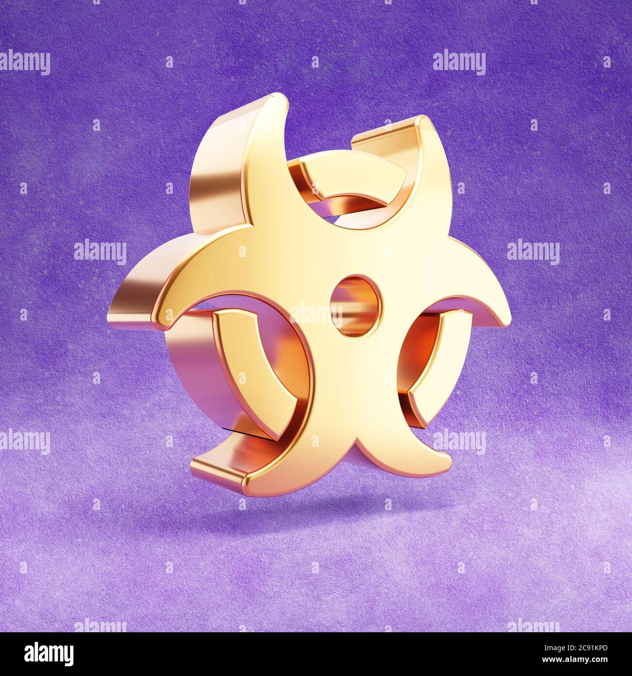 Biohazard icon Gold glossy Biohazard symbol isolated on violet velvet