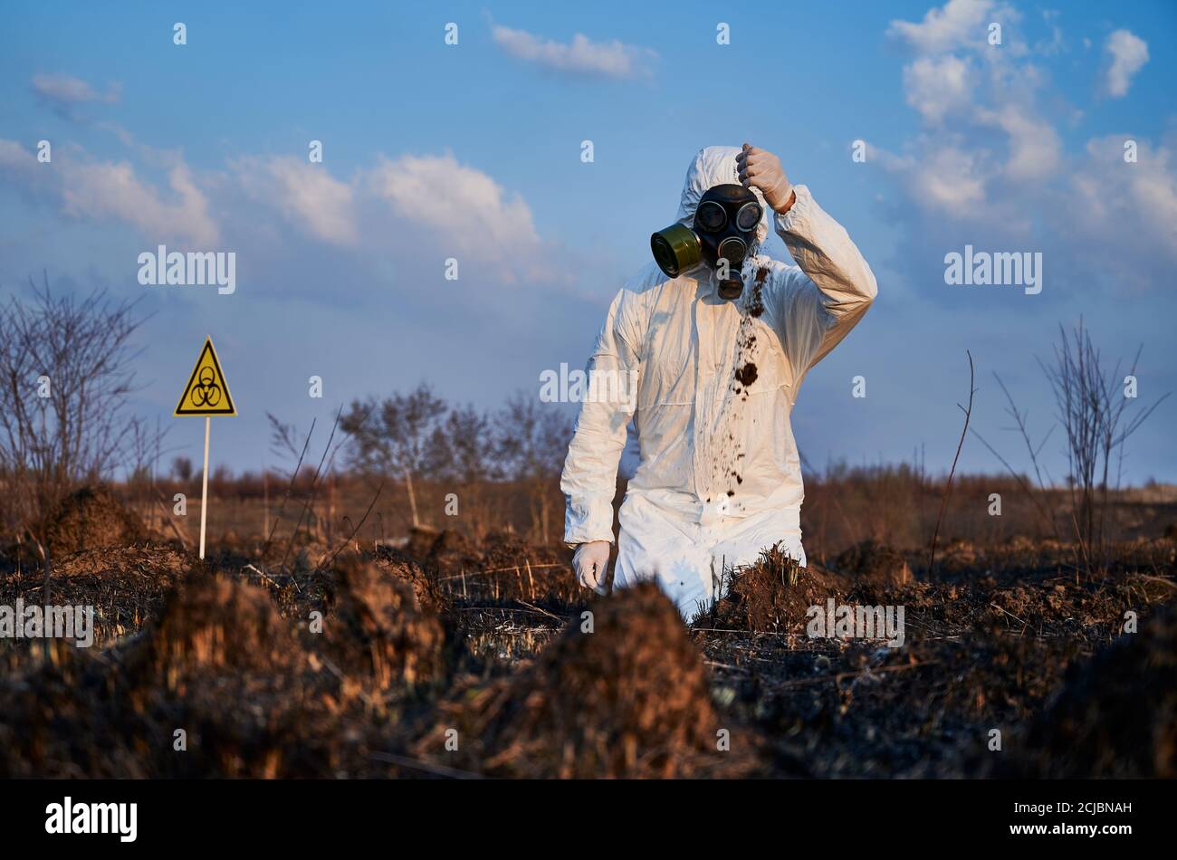 Horizontal snapshot of a scientist wearing a white protective suit