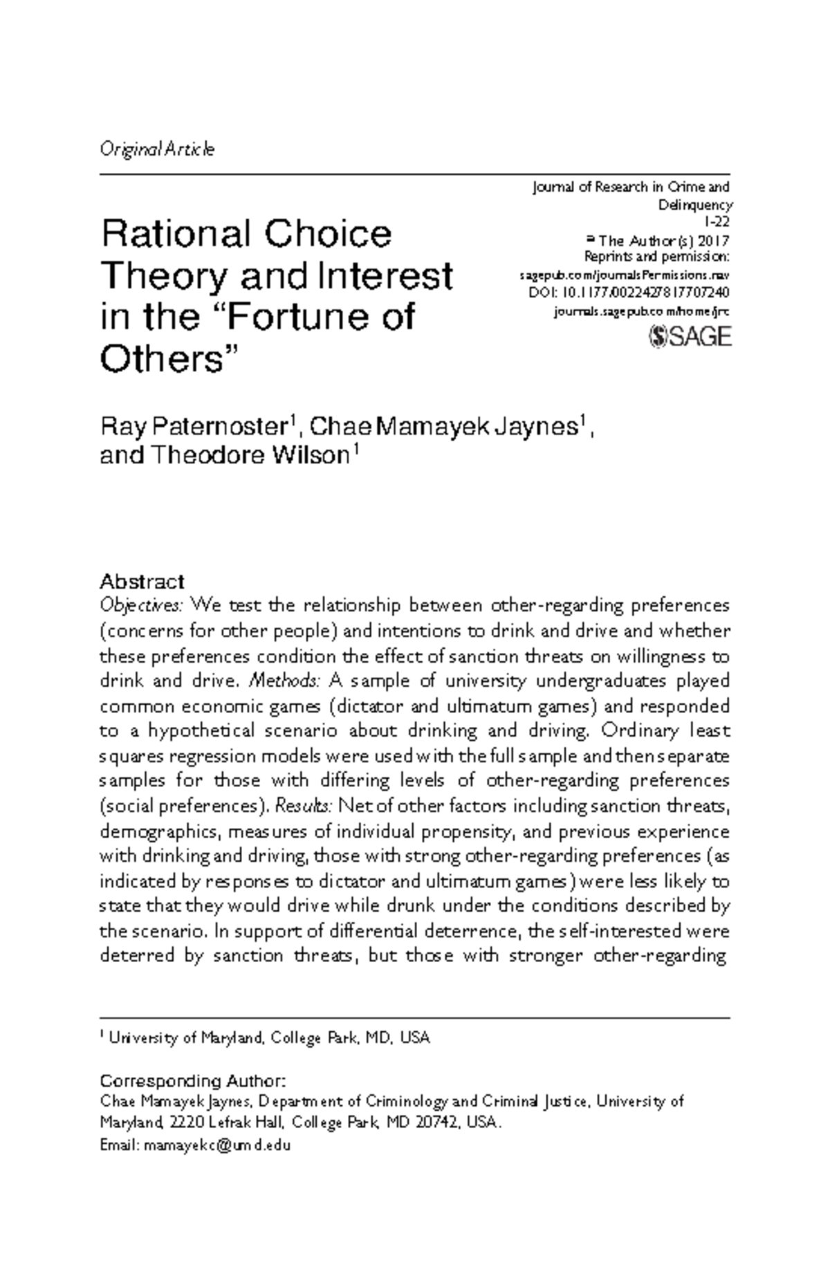 Rational Choice Theory and Social Preferences in Drinking and Driving
