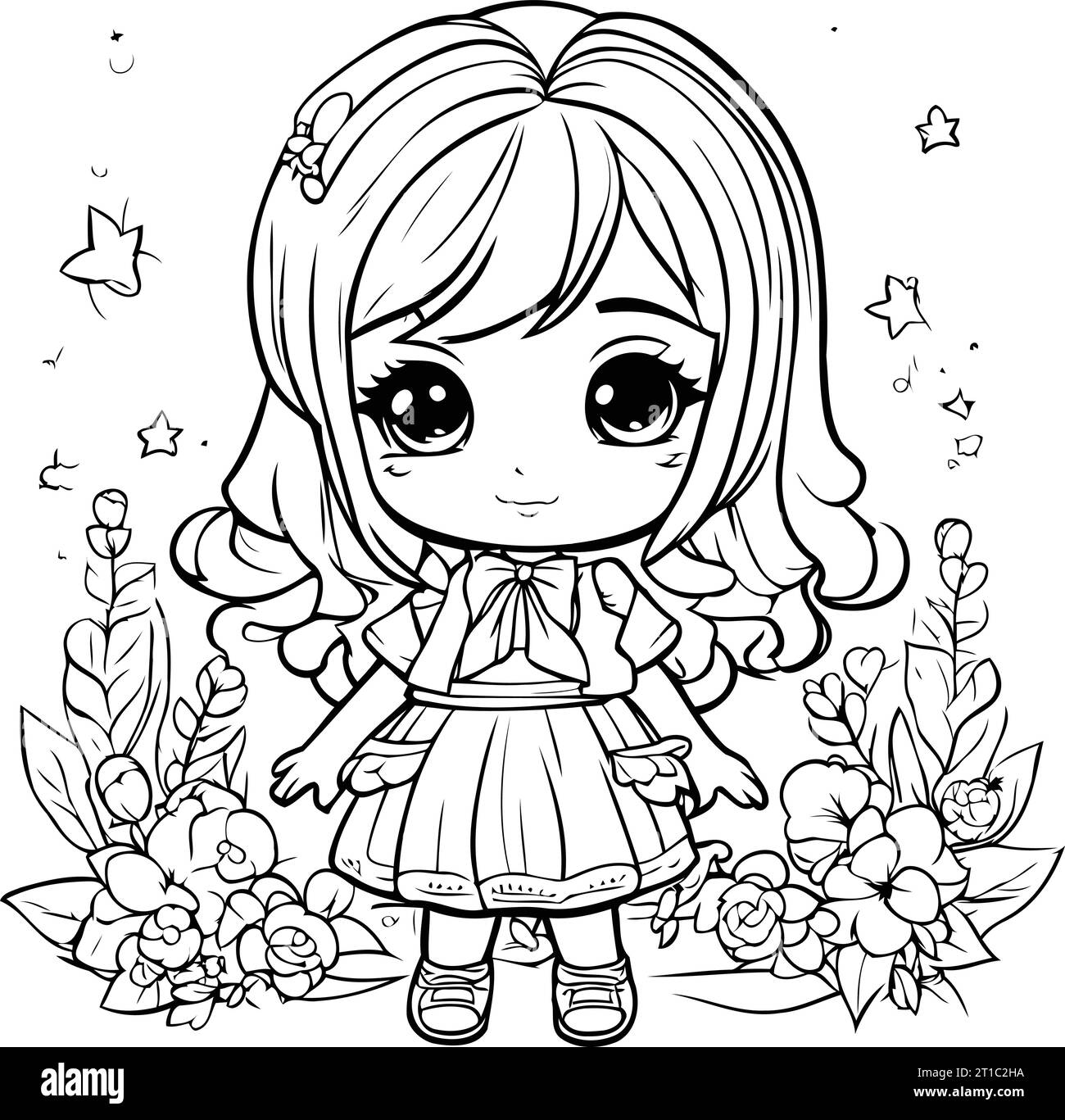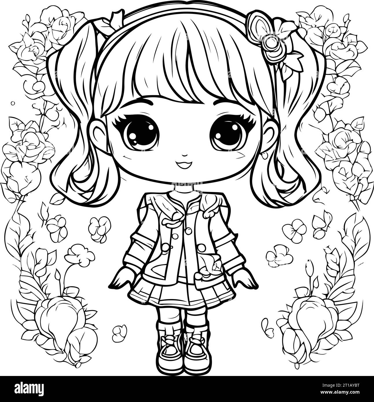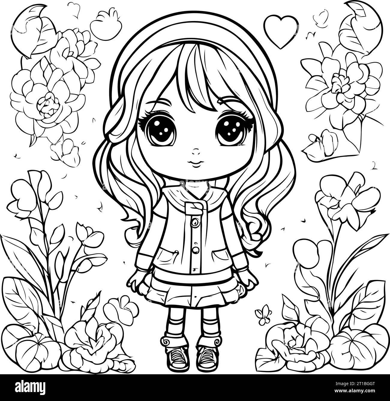 Cute cartoon girl with flowers Vector illustration for coloring book