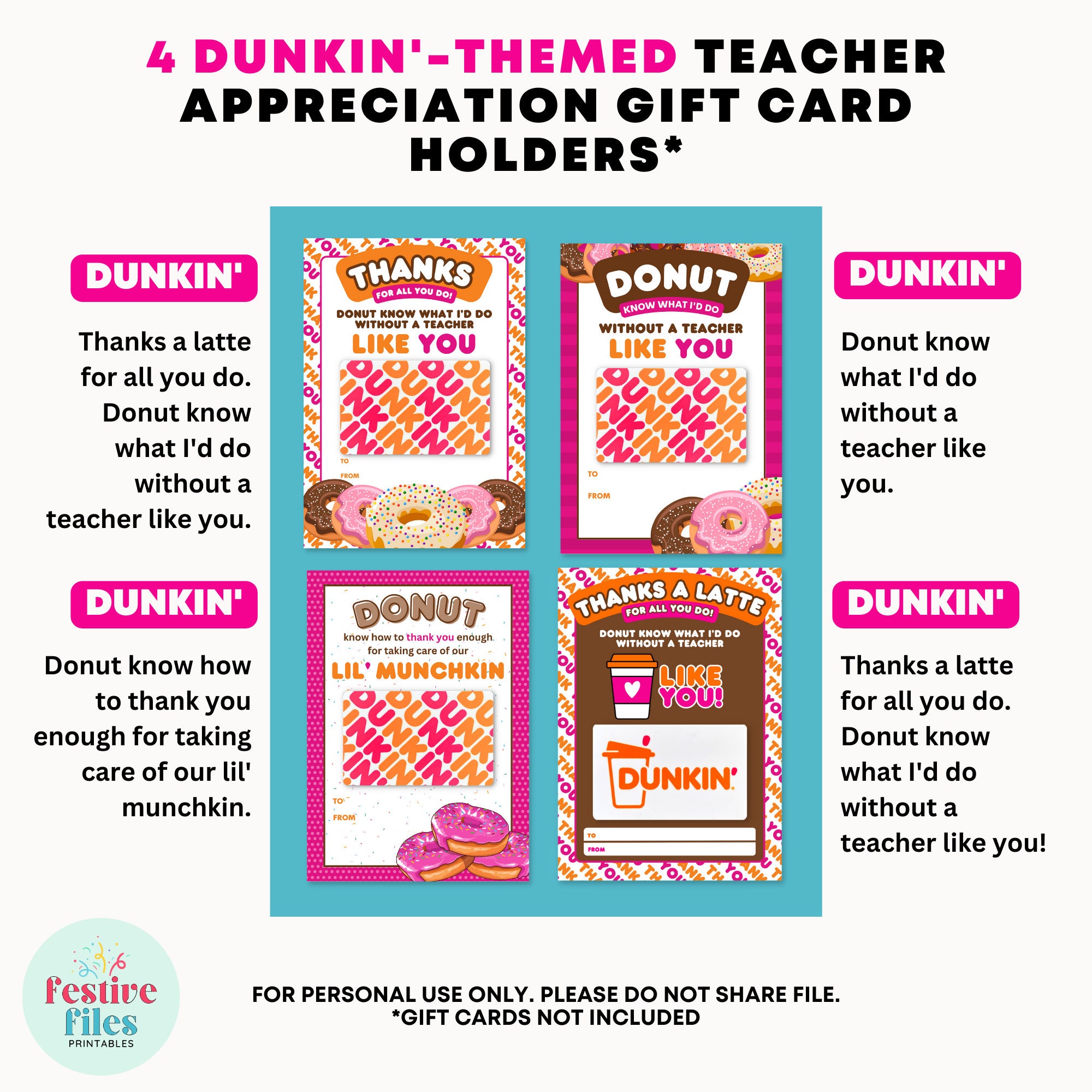 Multi pack of Teacher Gift Card Holders for Dunkin Donuts (printable
