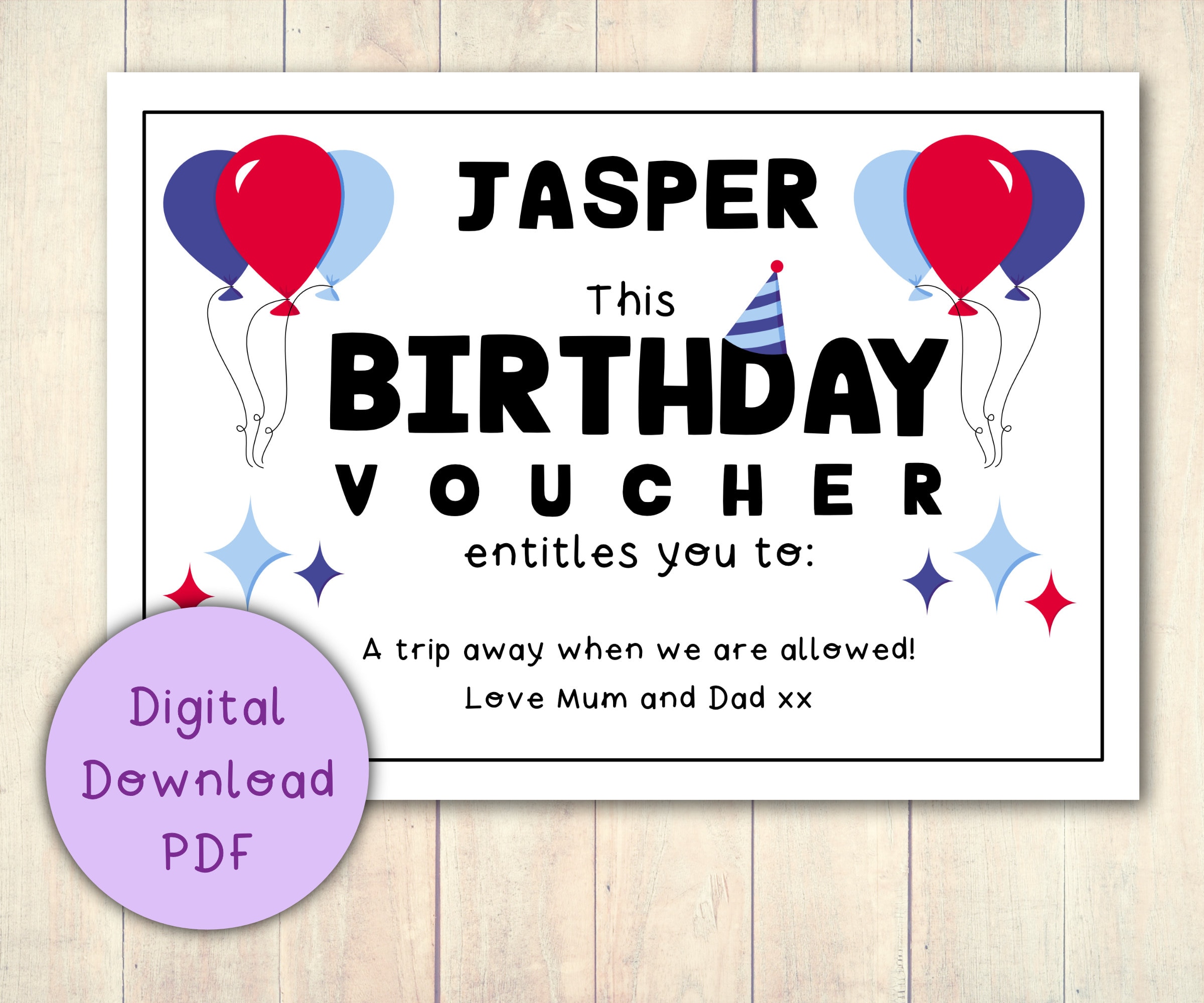 Birthday Gift Voucher Coupon Printable Digital Download PDF / Blue and