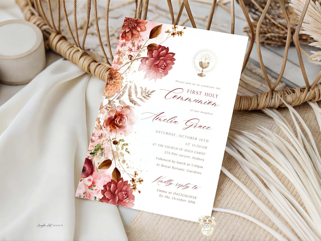 Editable AUTUMN Fall Red Gold Floral First Holy COMMUNION Girl