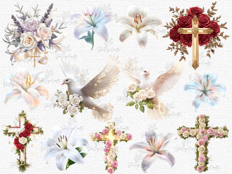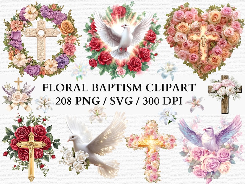 Floral Baptism Clipart Bundle Cross and Dove PNG SVG First Communion