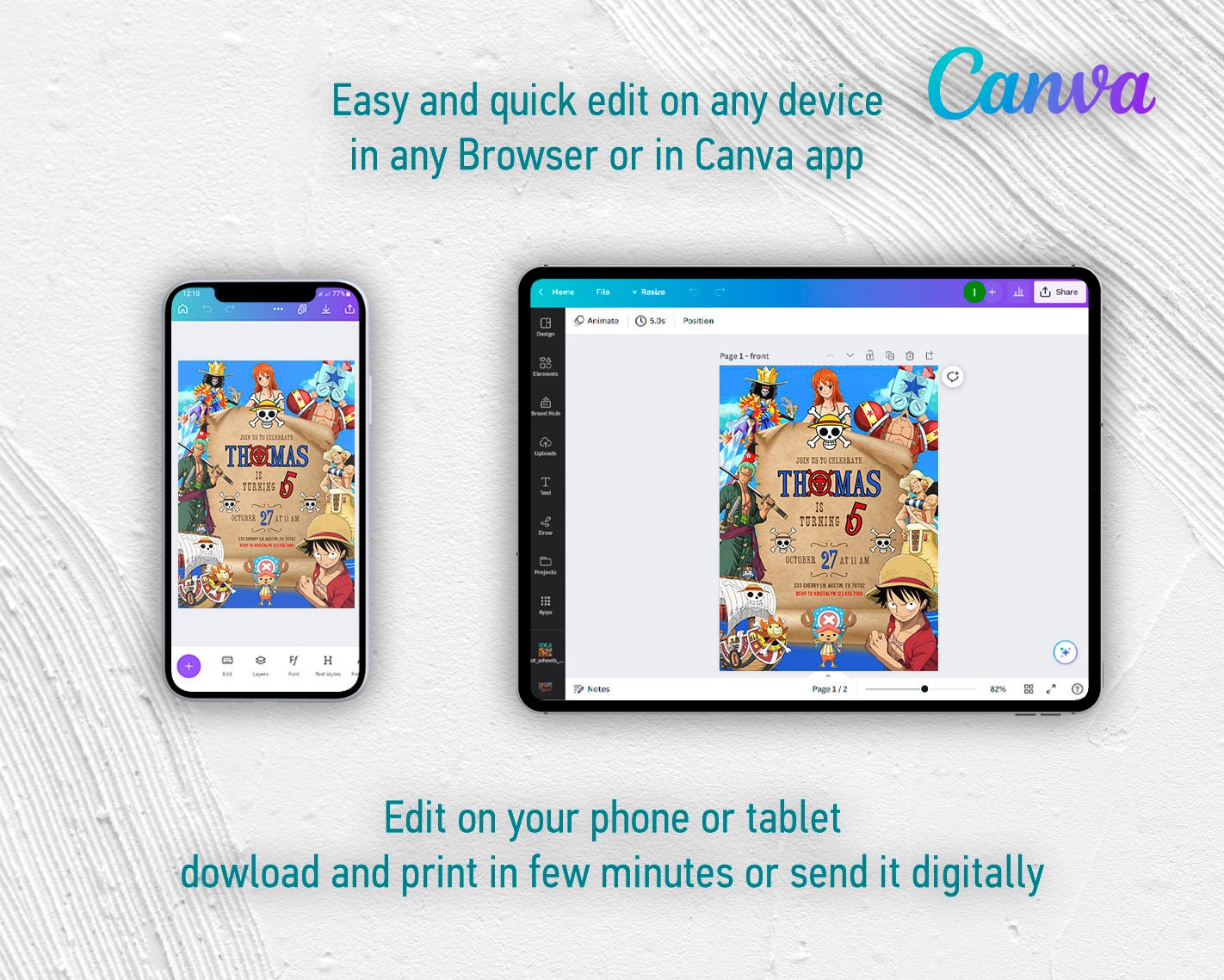 Printable Anime Birthday Invitation Editable Straw Hat Pirat Bday