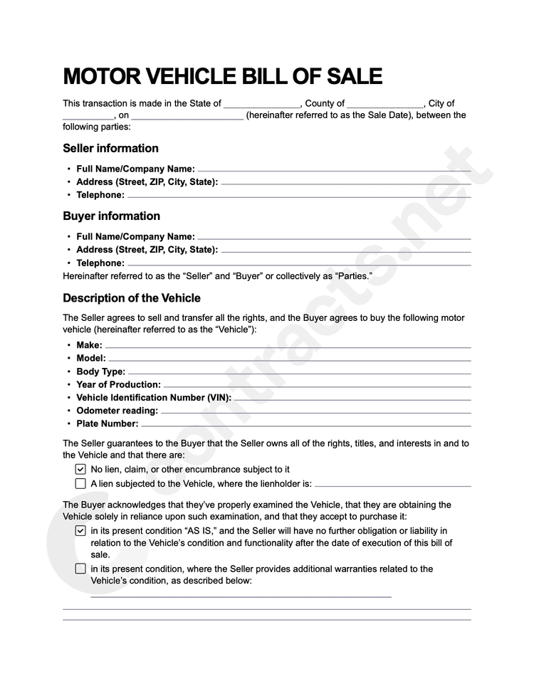 Texas Motor Vehicle Bill of Sale Free Forms (Word PDF)