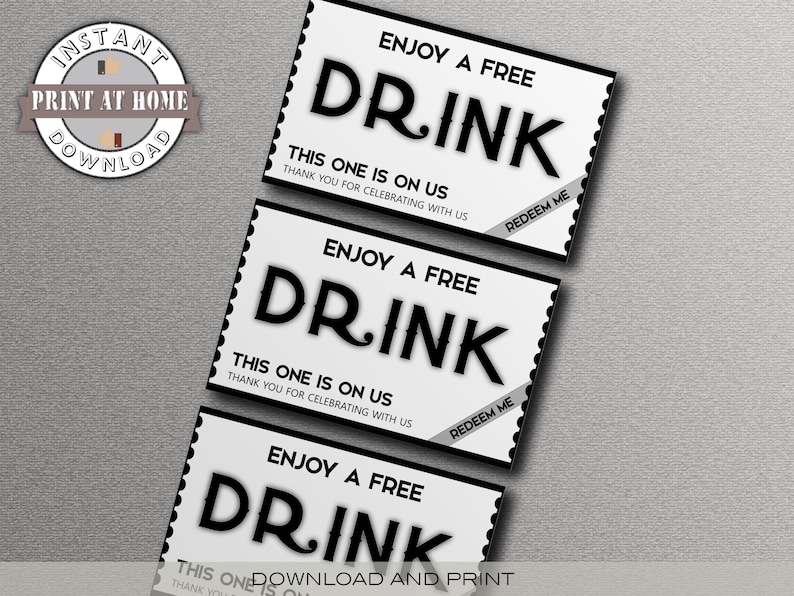 Printable One Free Drink Tickets Party Tickets Instant Downlaod Not