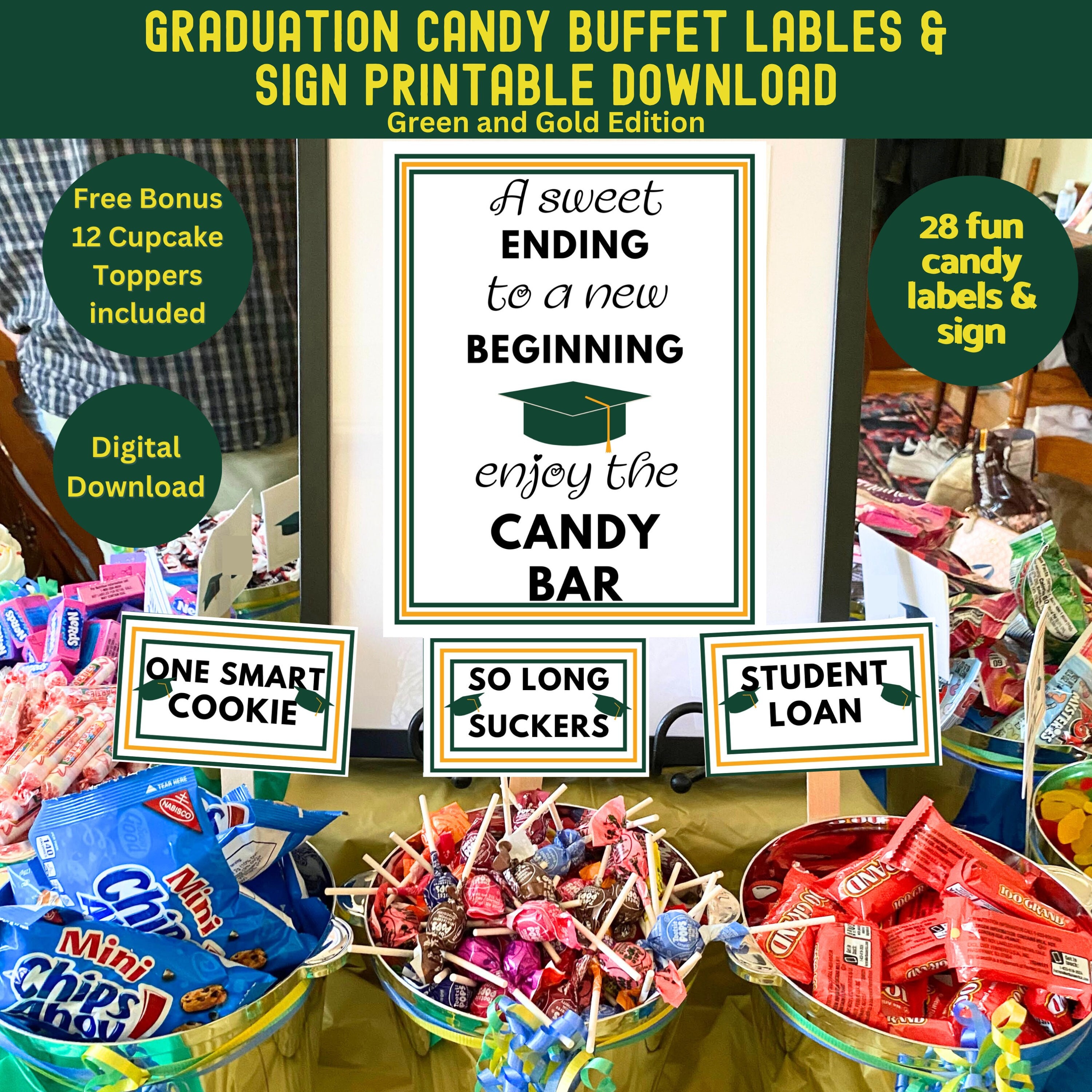Graduation Candy Buffet Sign and Labels Printable Green Gold Candy Bar
