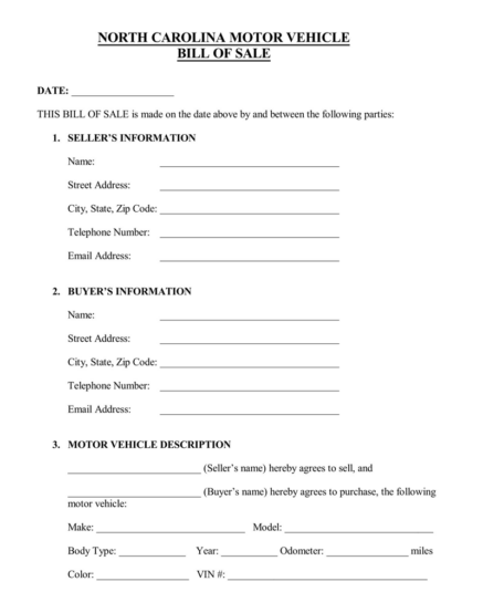 Free North Carolina Motor Vehicle Bill of Sale Form PDF eForms