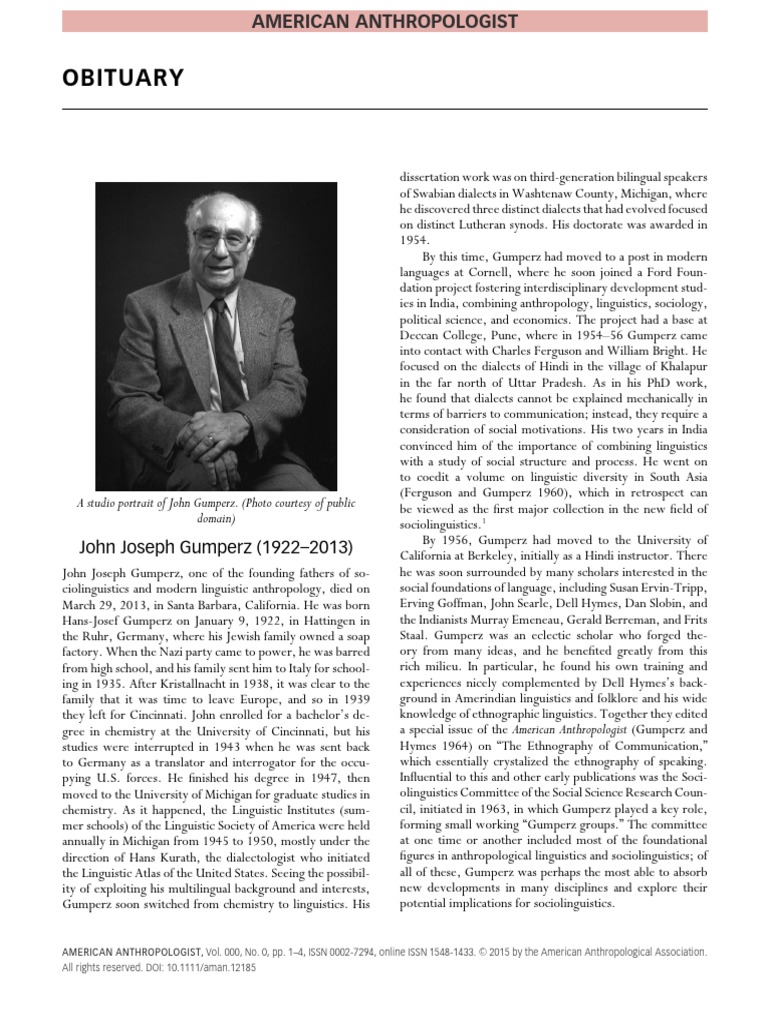 Founding Father of Sociolinguistics: An Obituary for John Gumperz (1922