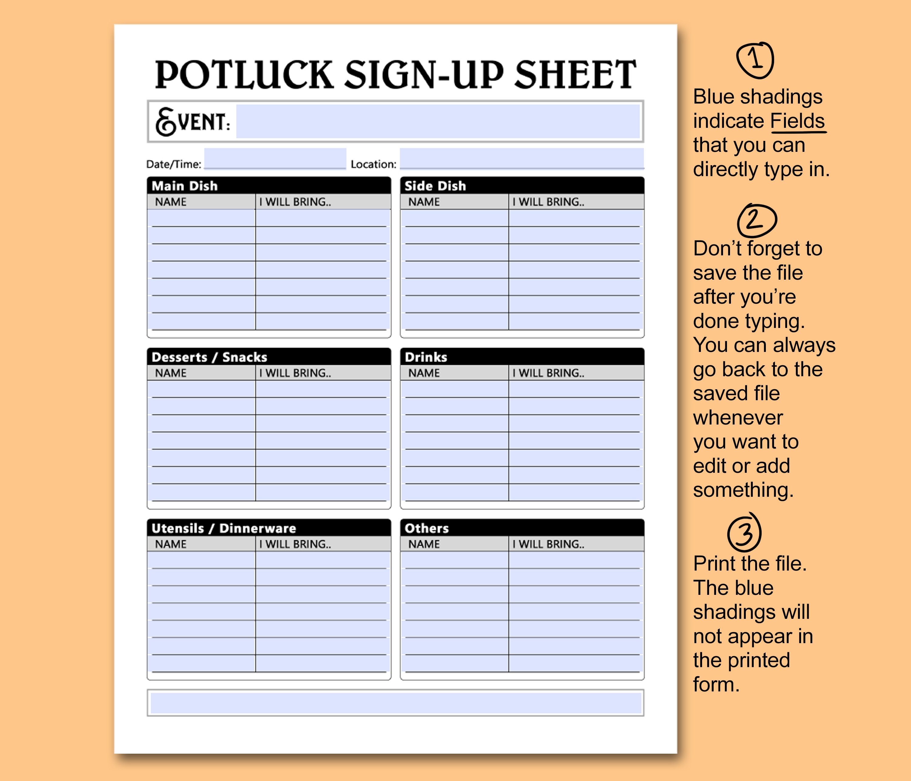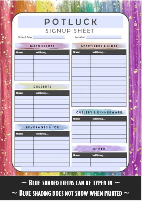 Potluck Sign up Template Editable Printable and Fillable Sign up