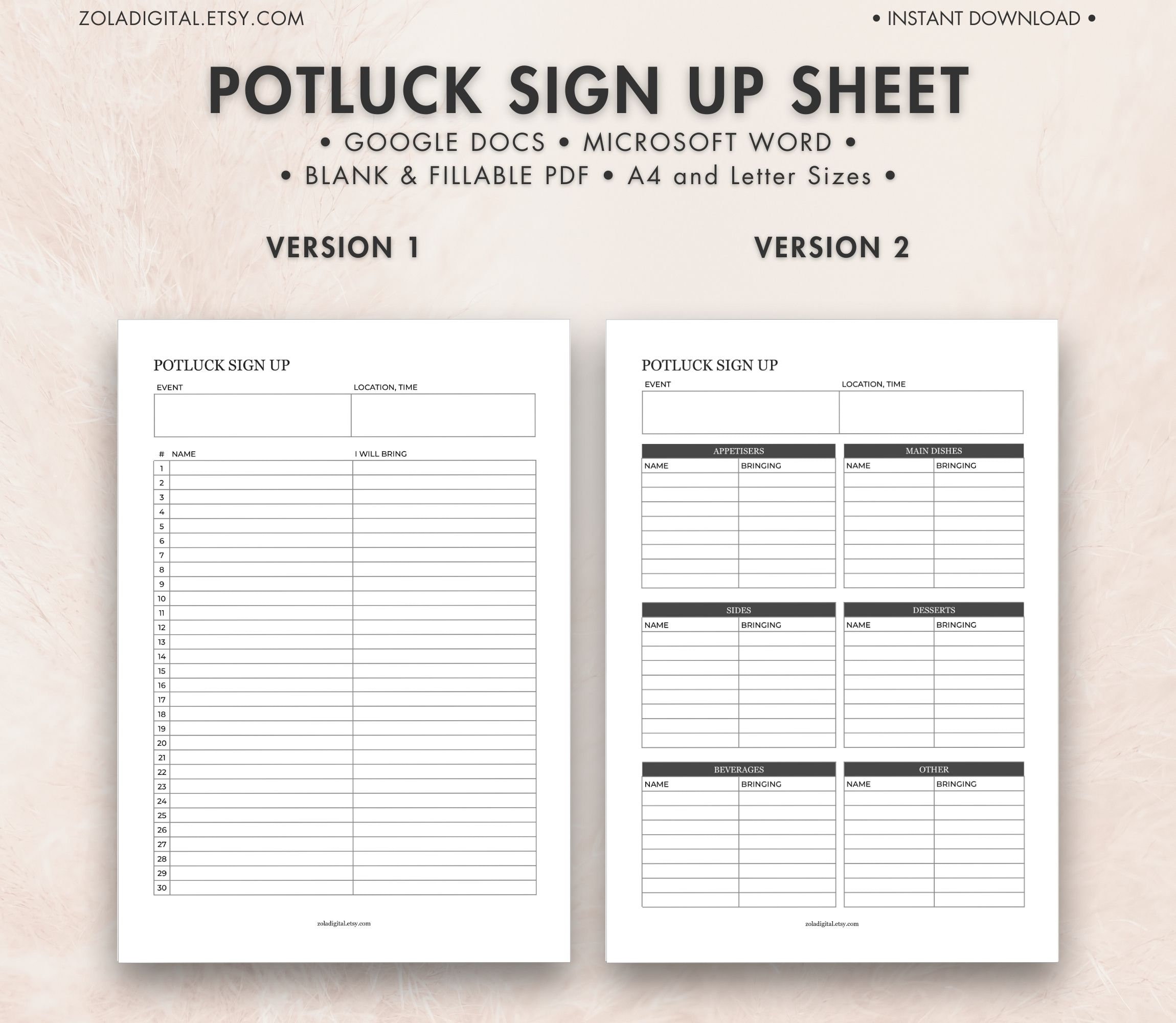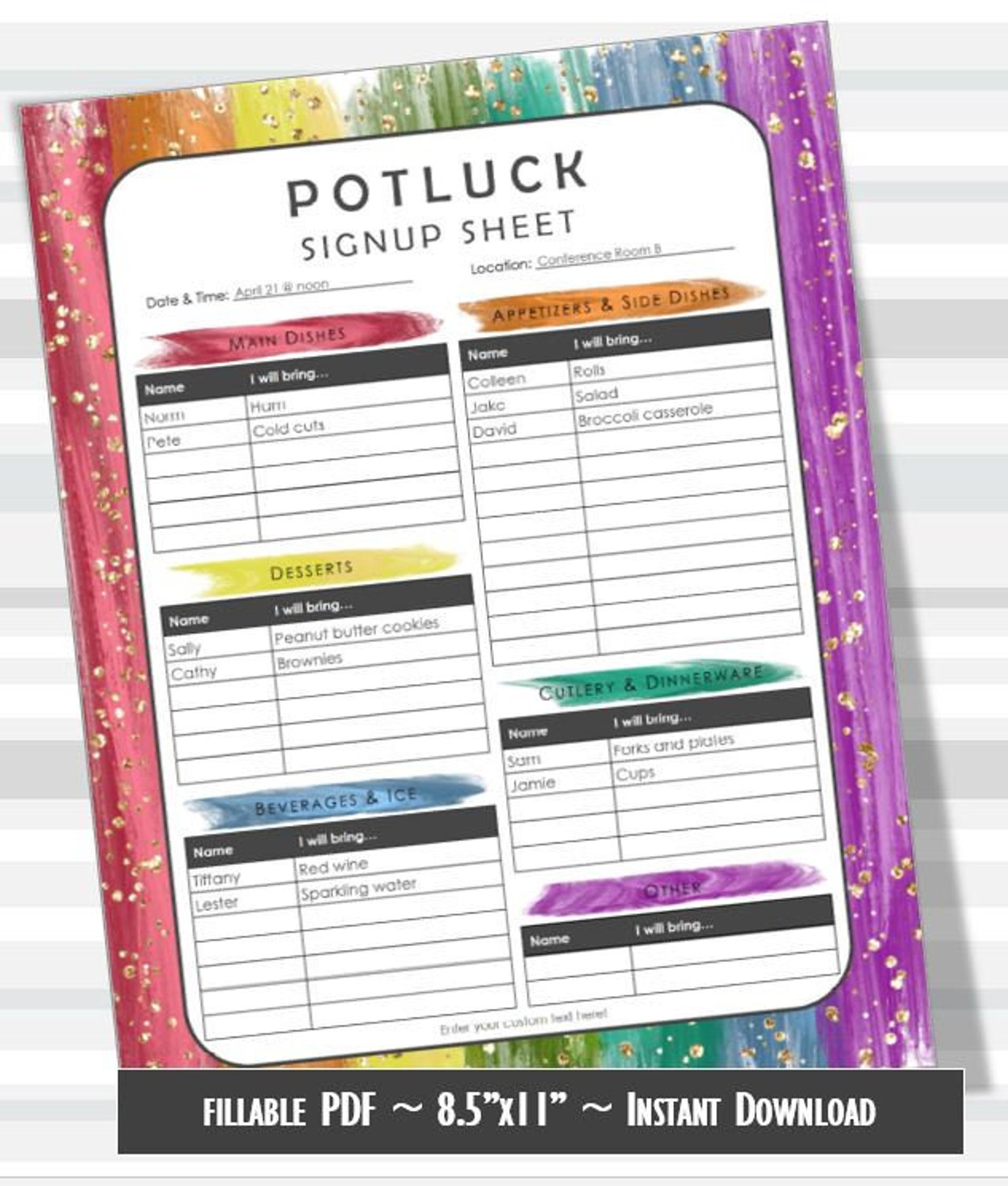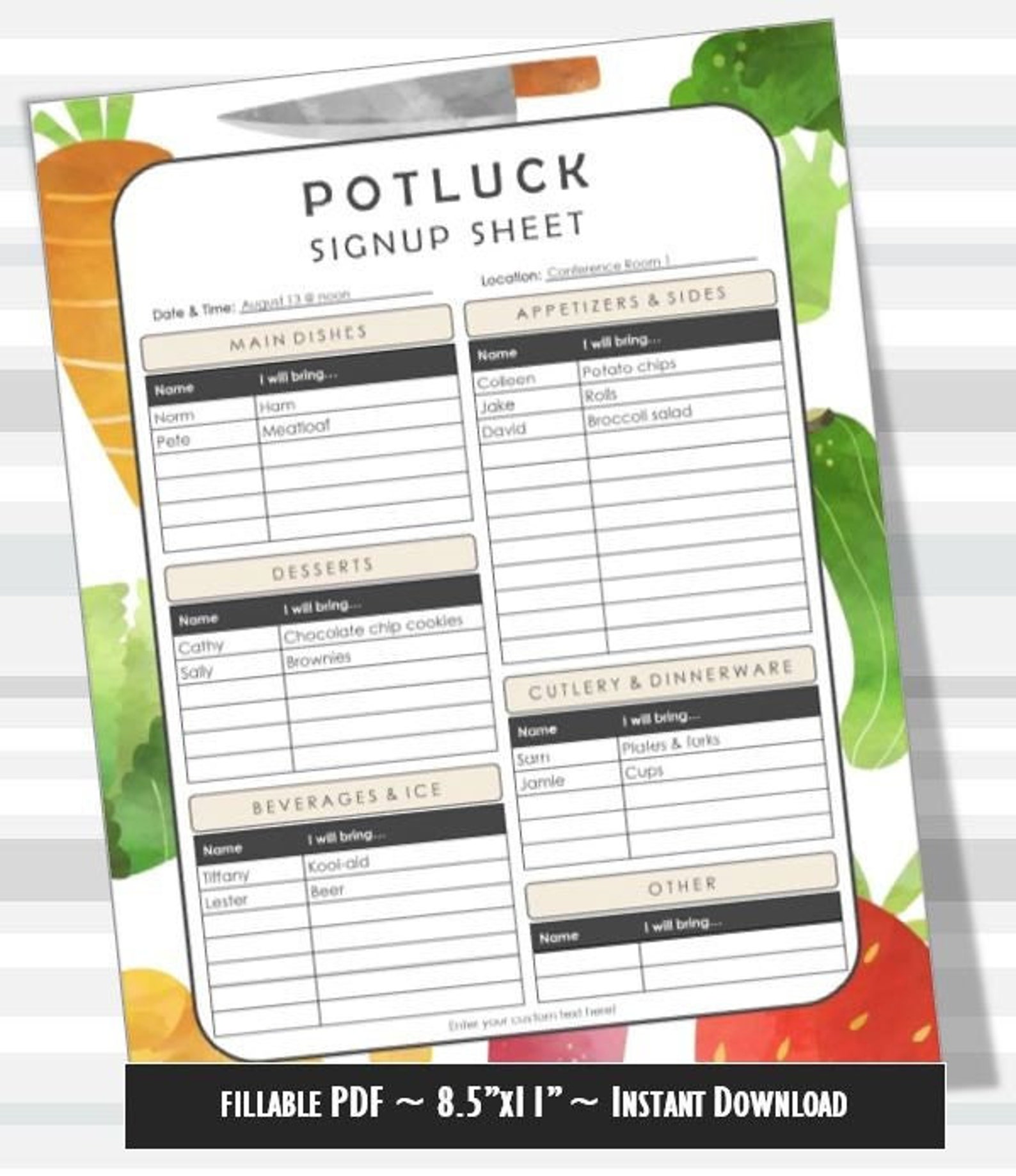 Potluck Sign up Sheet Printable Fillable PDF Dinner Party Etsy UK