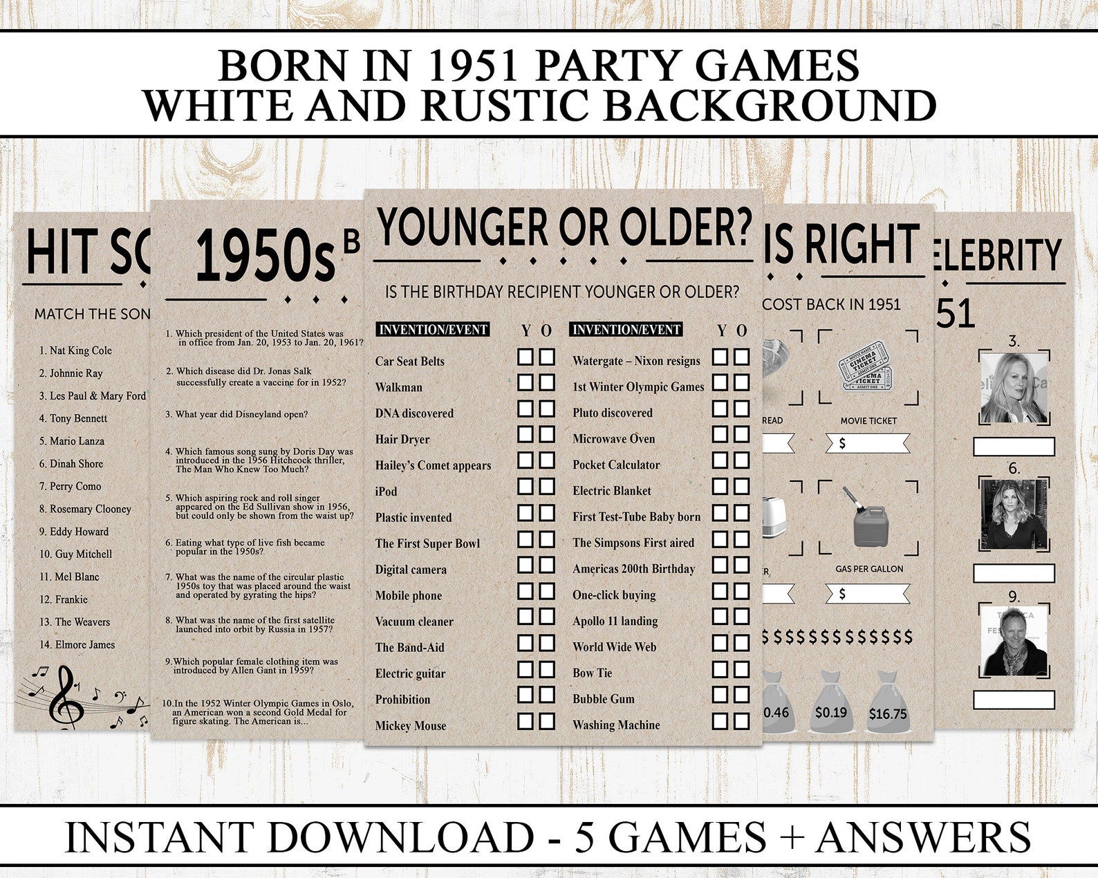 70th Birthday Party Games Printable Born in 1951 1950s Game Etsy