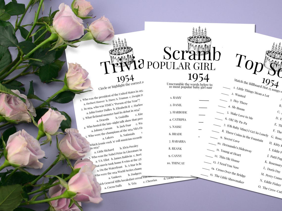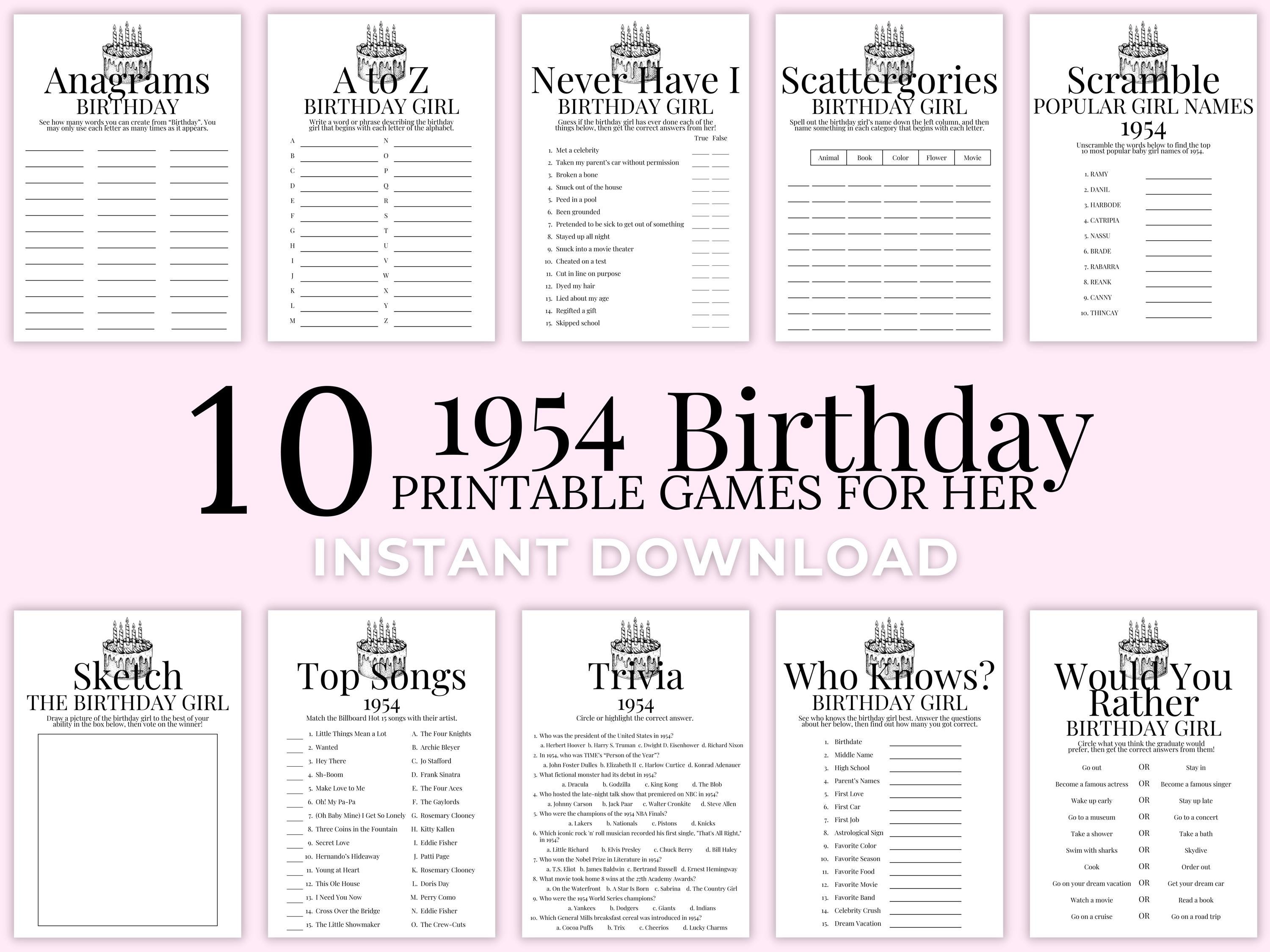 70th Birthday Printable Party Game Bundle Birthday Girl Gift 1954