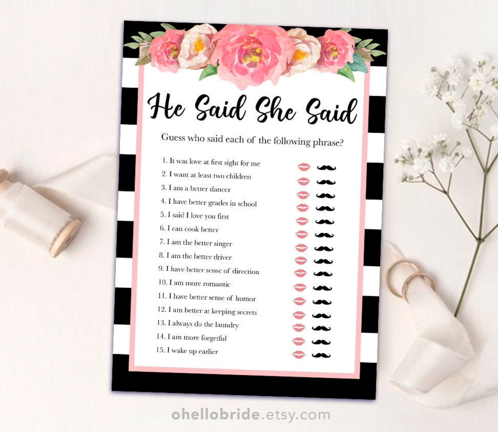 He Said She Said Bridal Shower Game (Printed ) Emmaline Bride