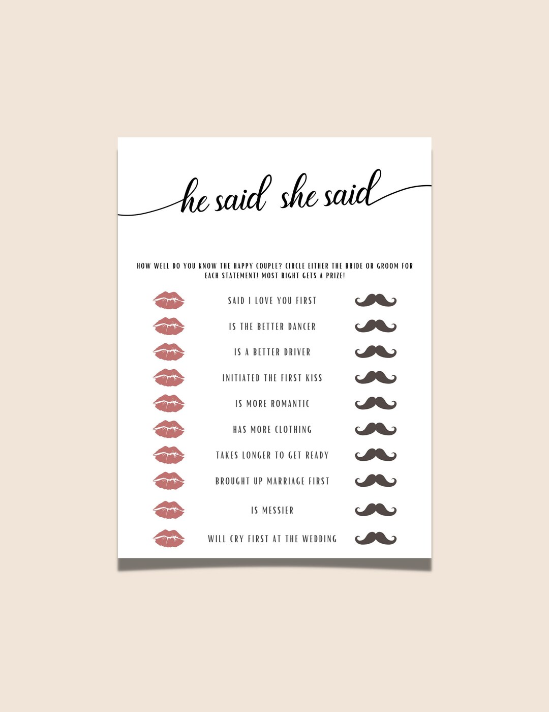 He Said She Said Game Bridal Shower Games Printable PDF G107 Etsy