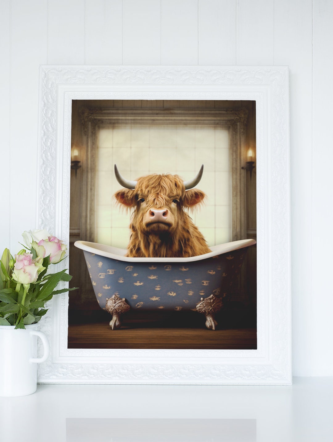 Highland Cow in Bathtub Printable Wall Art Whimsical Animal Portrait