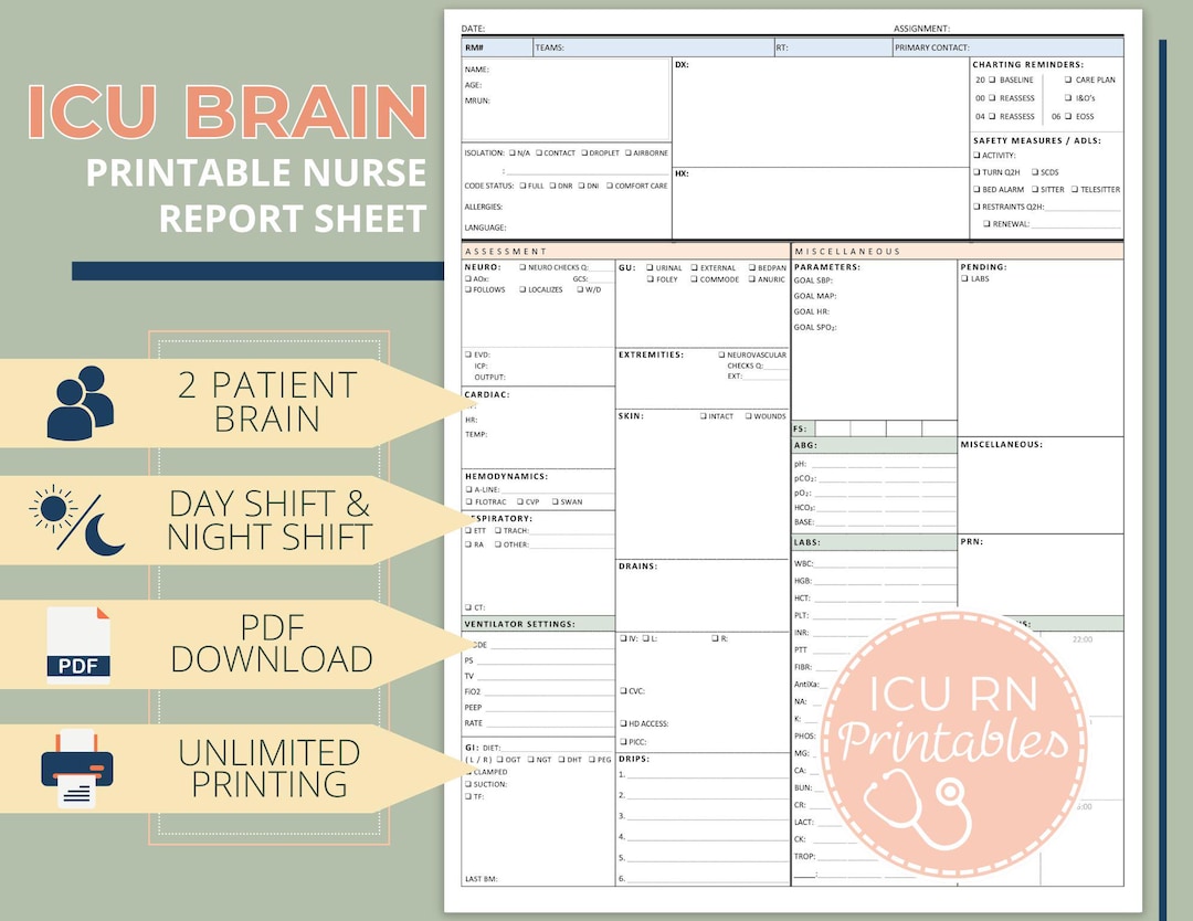 ICU Nurse Brain Report Sheet Printable PDF Download Etsy