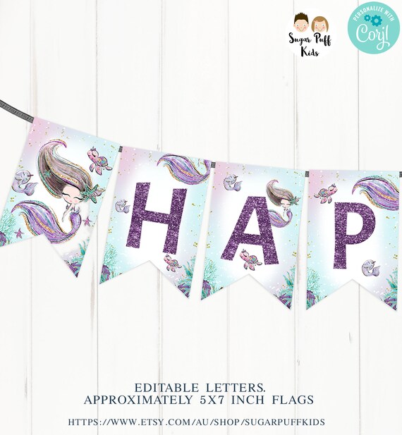 Editable Mermaid Happy Birthday Banner Mermaid Happy Birthday Bunting