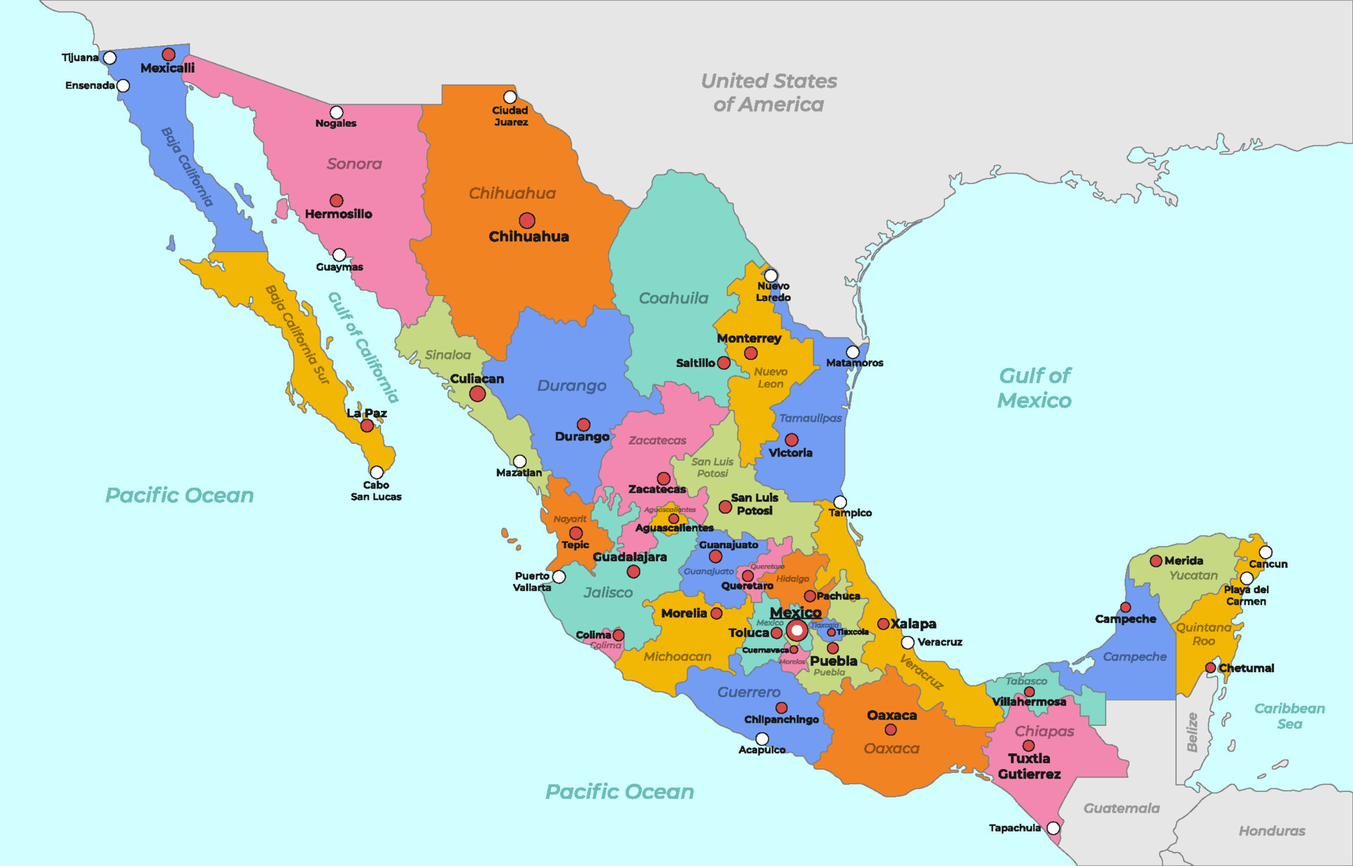 Mexico Map With State Capital And City Names Vector Art Graphics