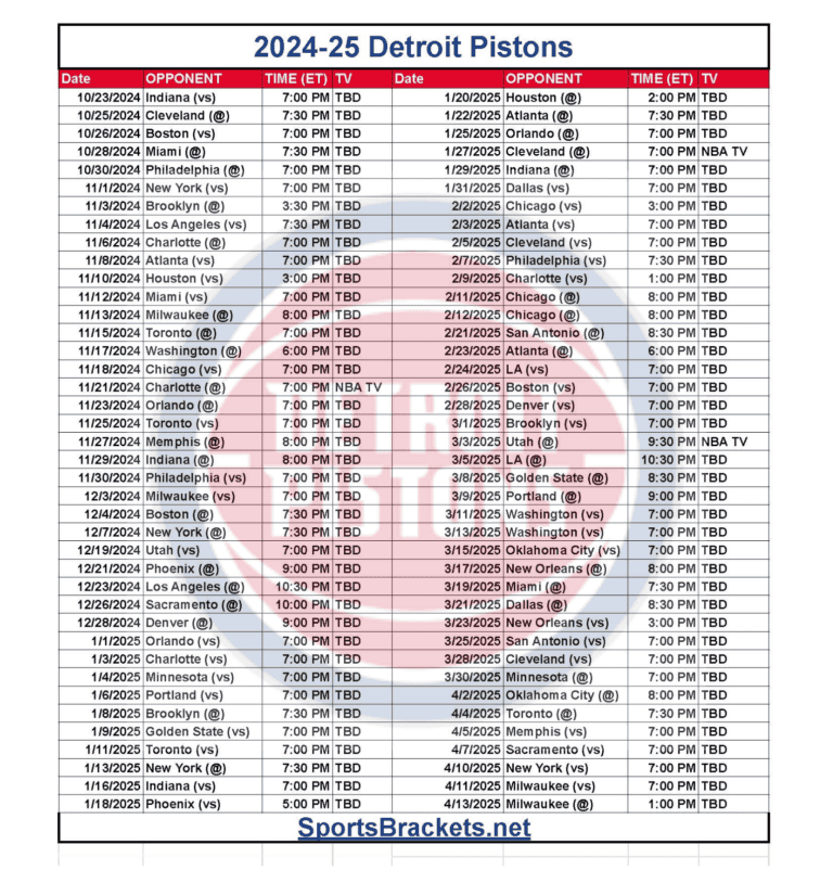 Printable 2024 25 Detroit Pistons Schedule TV Broadcasts and Matchups