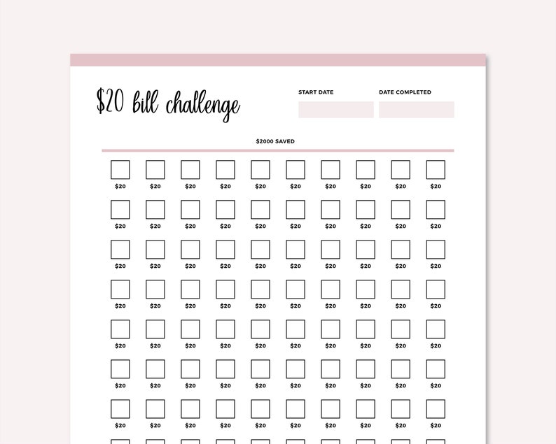 Buy Printable 20 Dollar Bill Challenge Cash Savings Challenge Savings