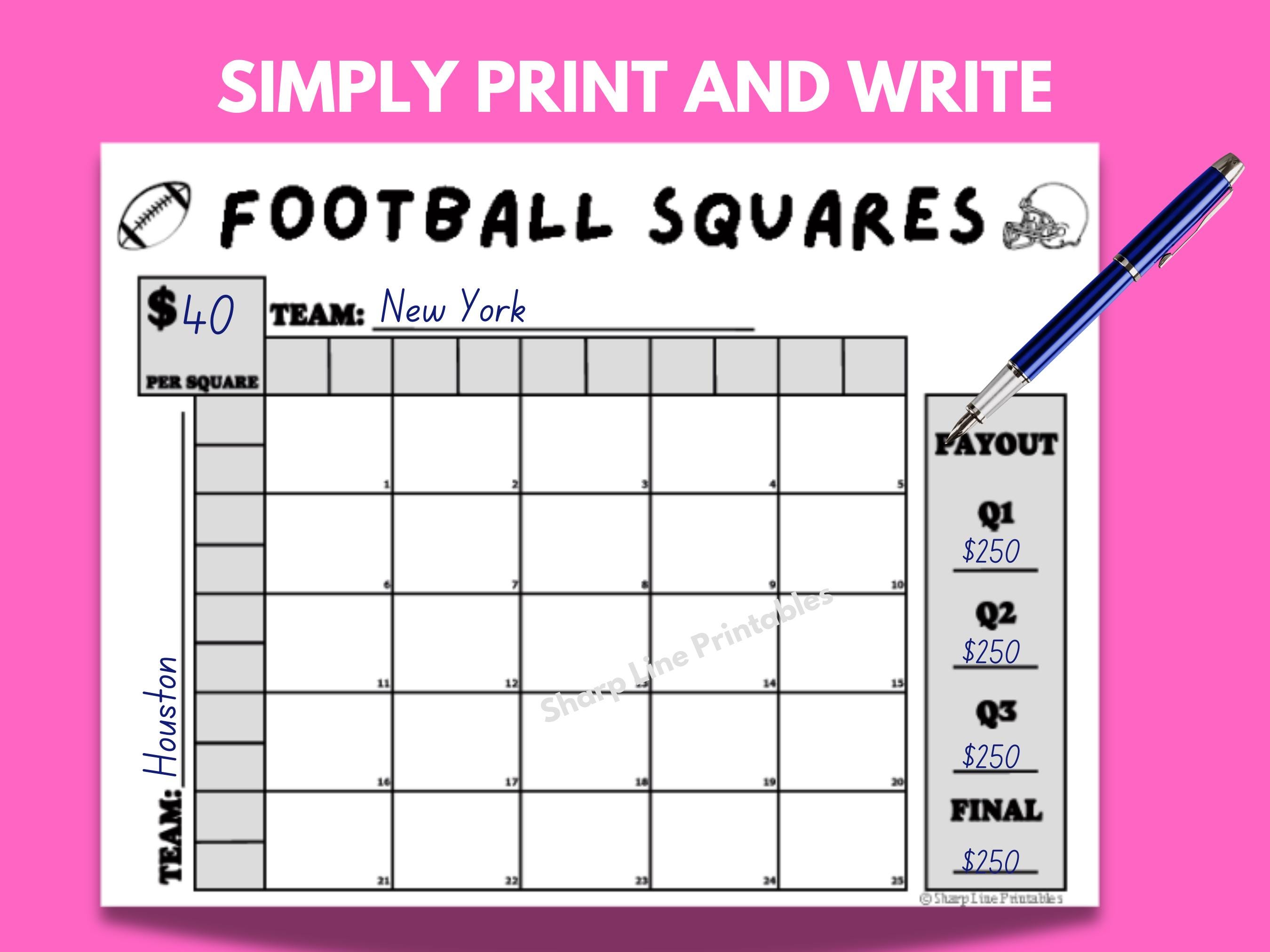 Football Squares Template 25 25 Square Grid Printable Etsy