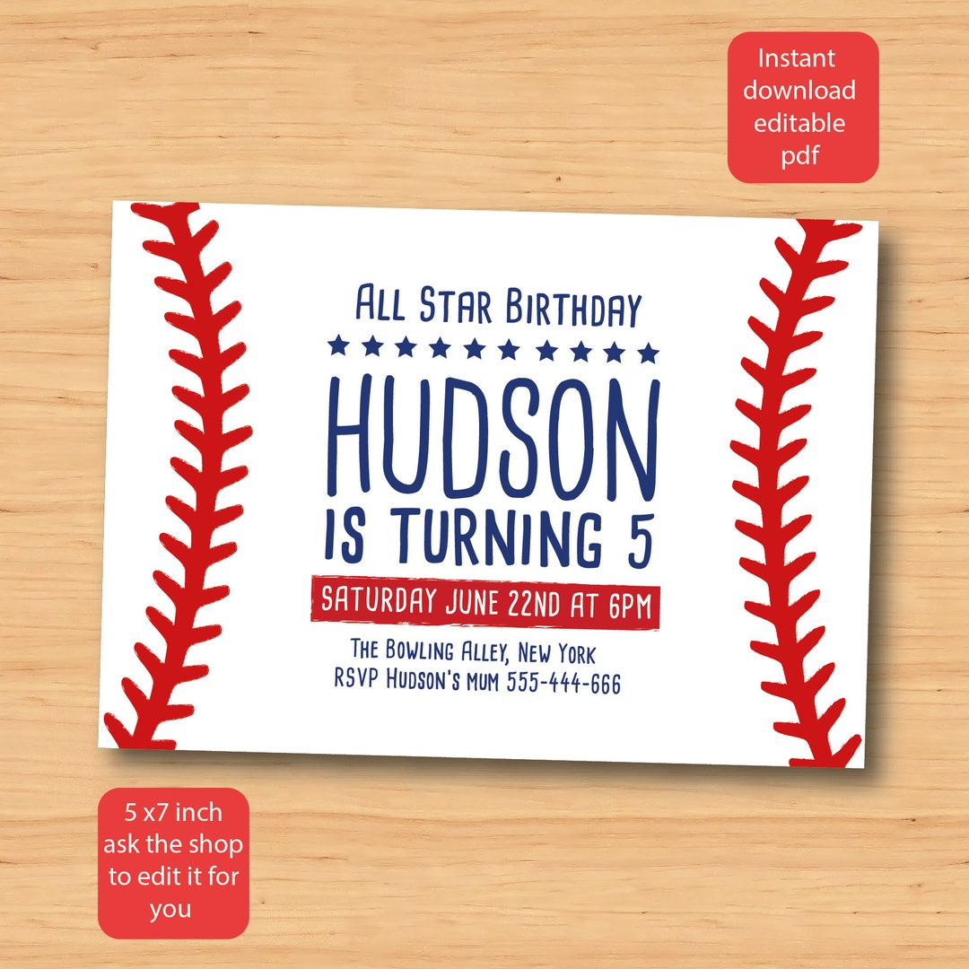 Baseball Birthday Invitation SELF EDITABLE PDF 5 X 7 Inch