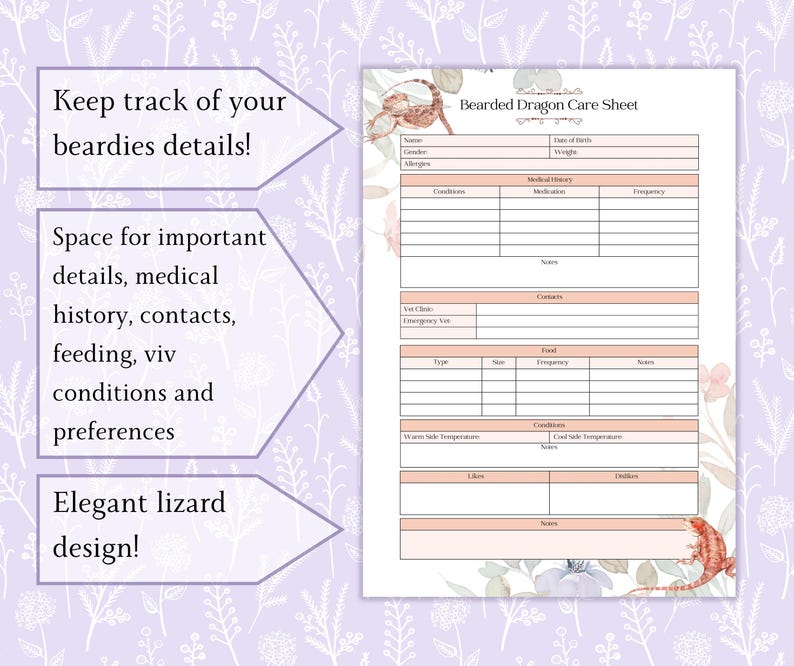 Bearded Dragon Care Sheet Printable PDF Bearded Dragon Chart Pet