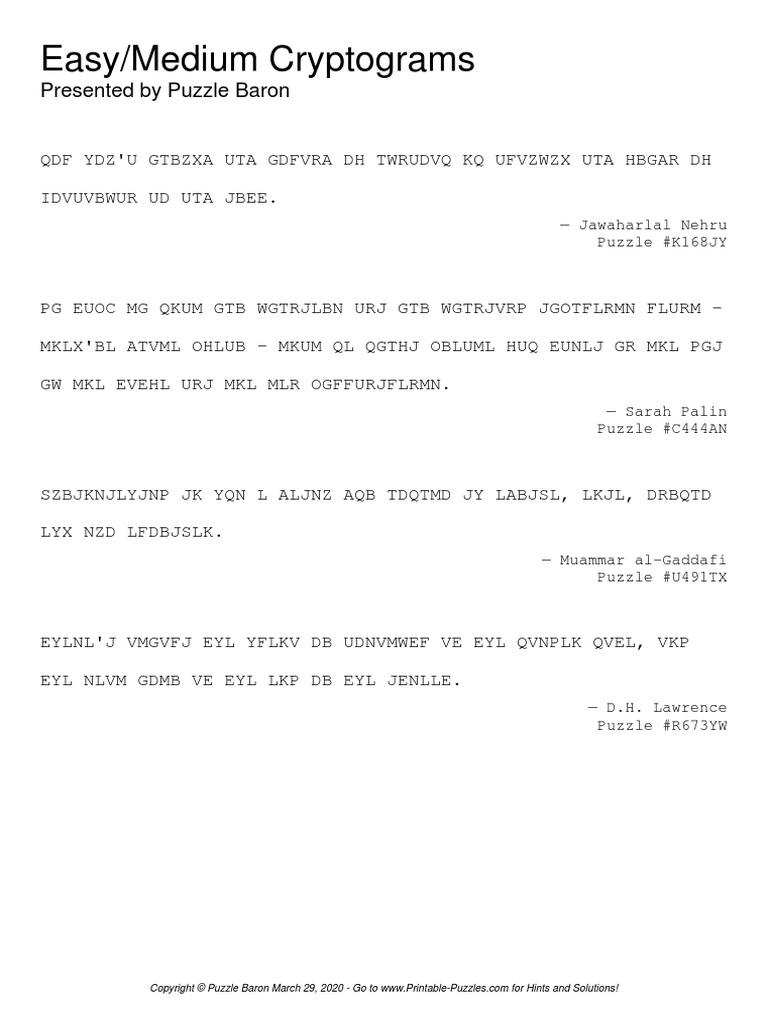 Printable Cryptograms Puzzle Baron