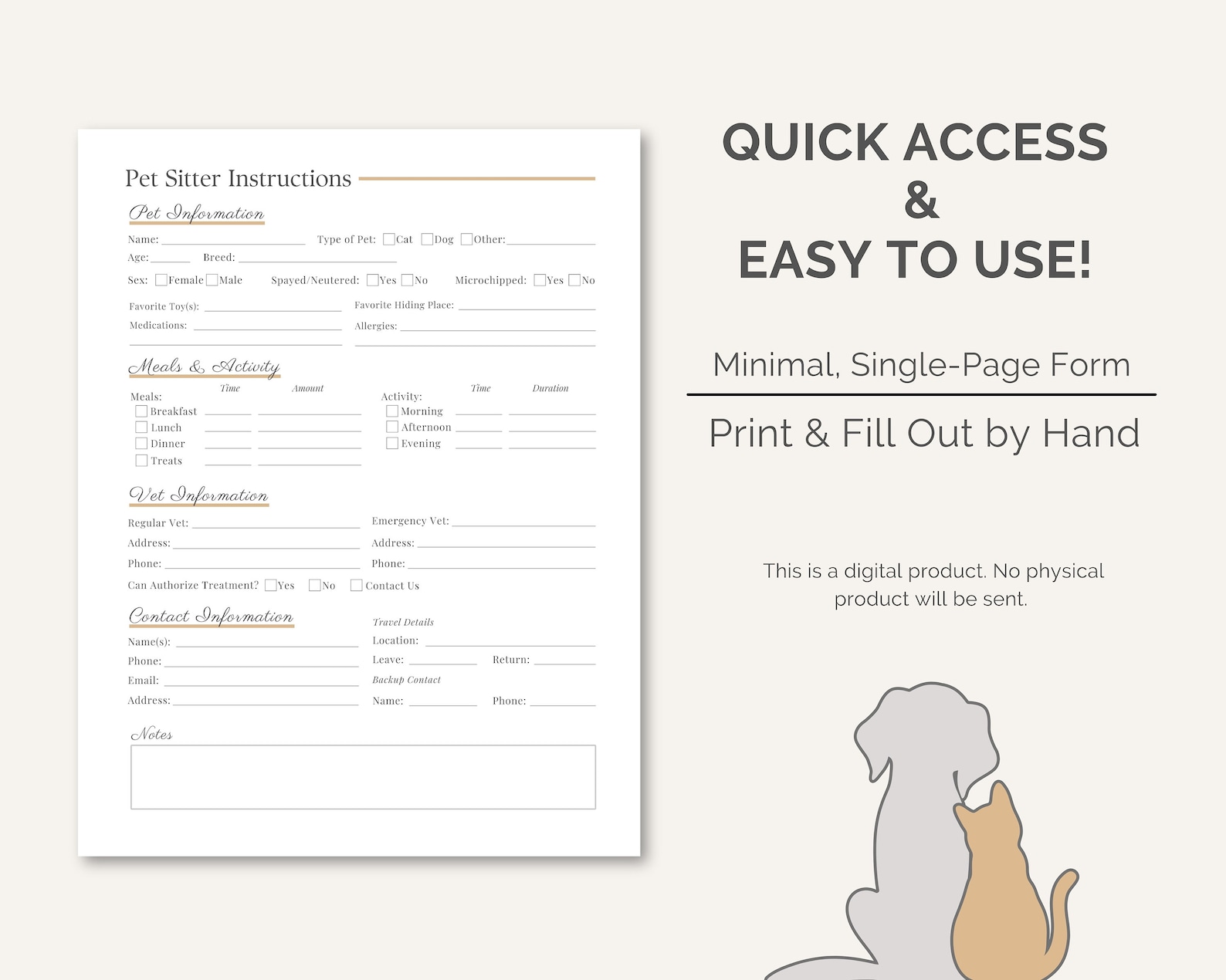 Pet Sitter Instructions Printable PDF Owner Info Template (dog Cat