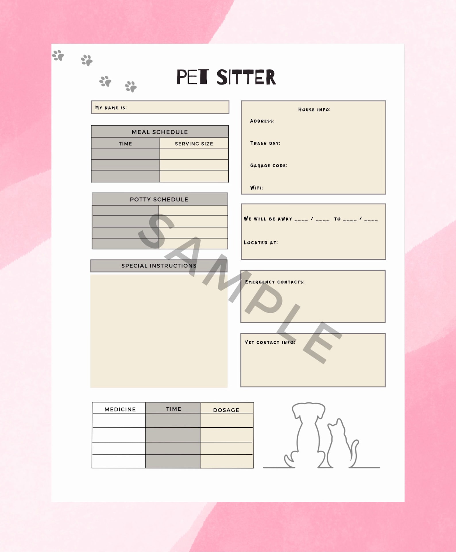 Dog or Cat Sitter Instructions Printable Pet Sitter Template Pet
