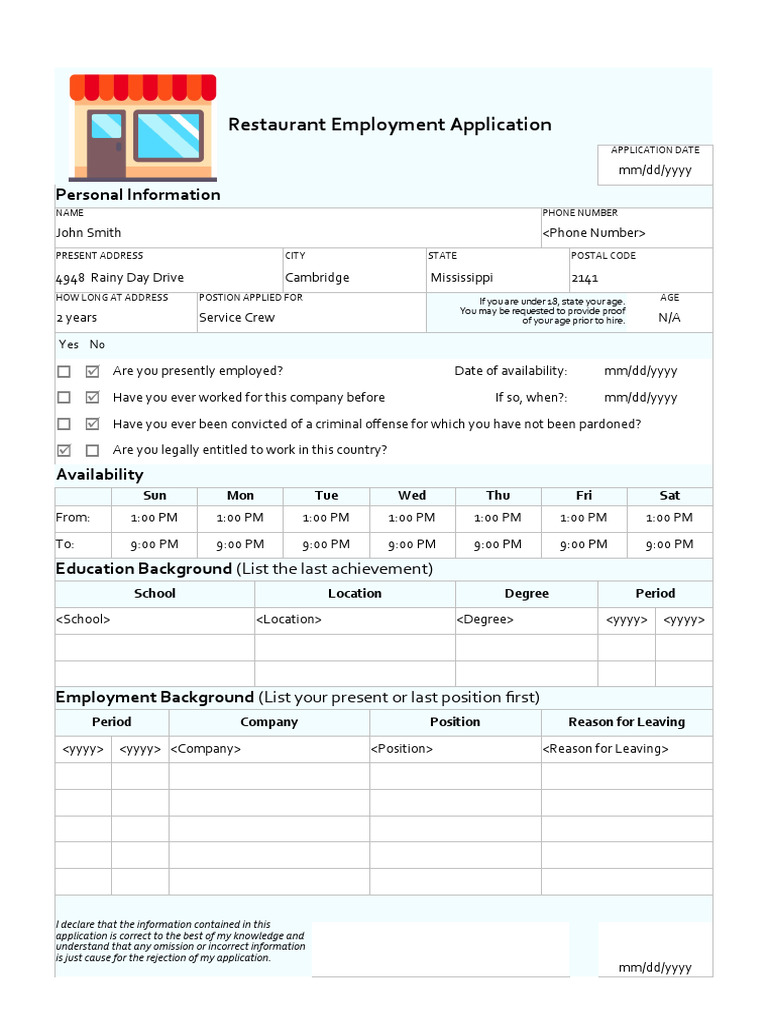 Restaurant Application Form Editable Application Template Application