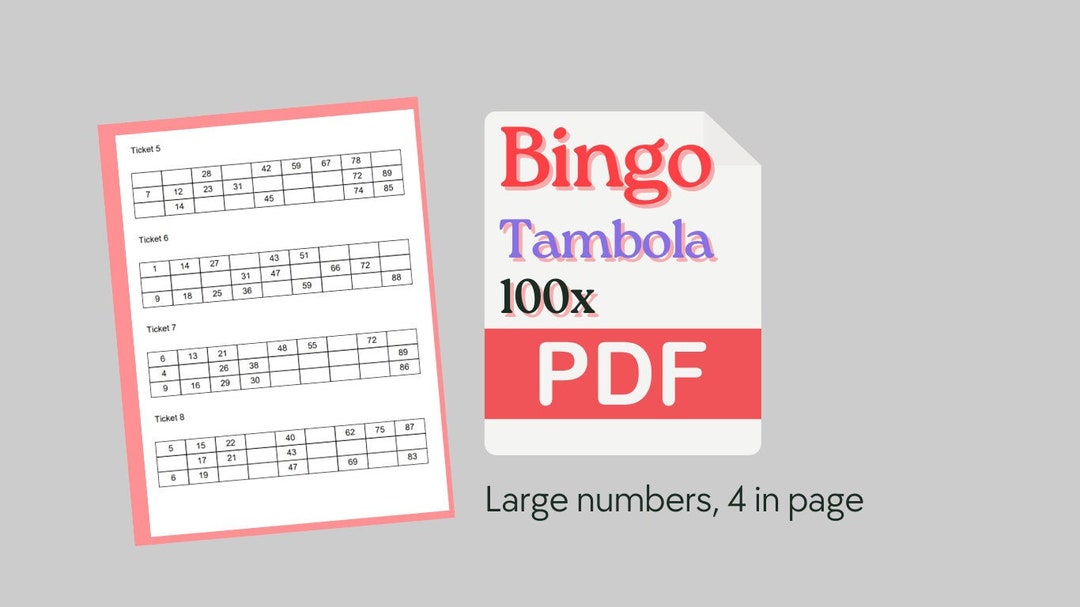 100 Tambola Tickets 25 Pages 4 Tickets per Page Large Numbers