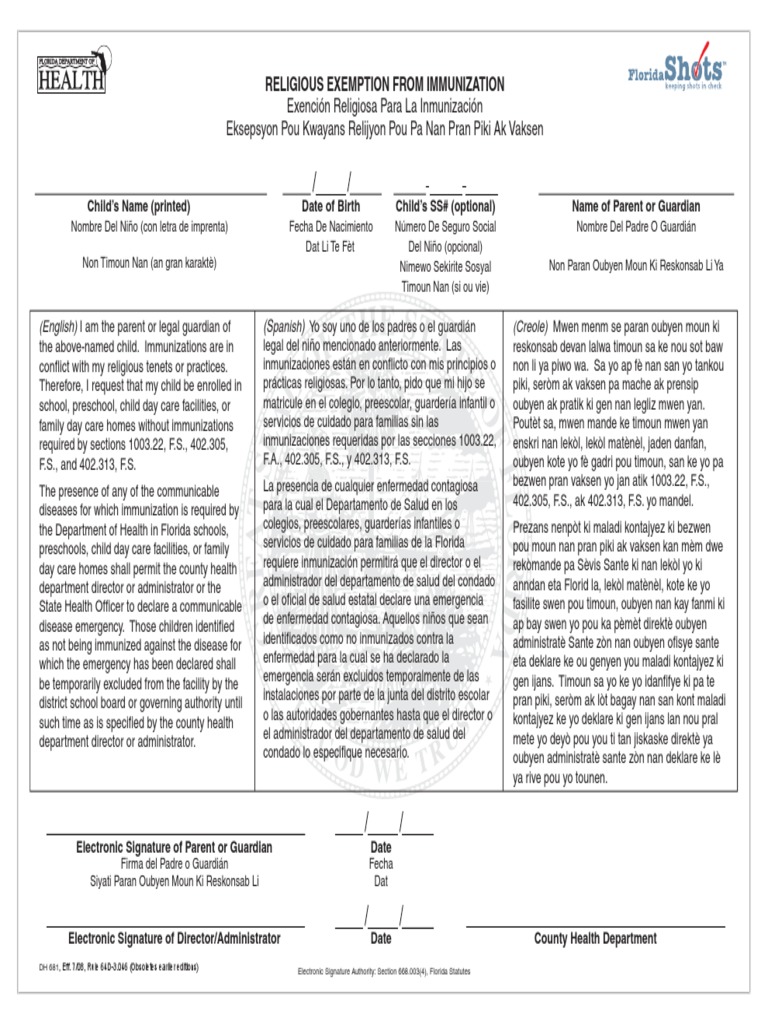 Religious Exemption Florida Dh 681 Form Printable
