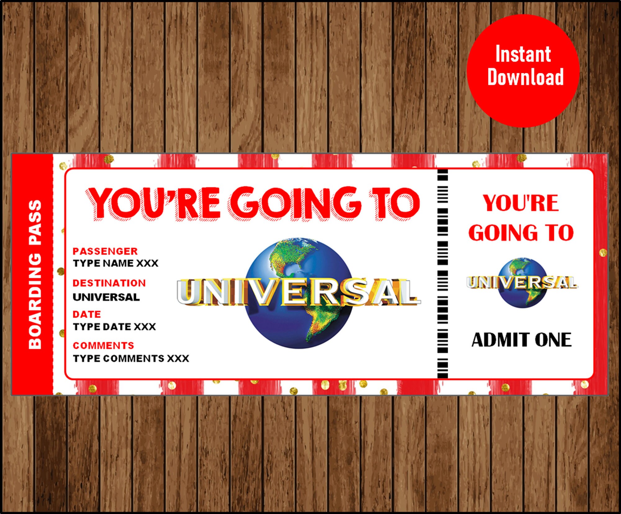Printable UNIVERSAL STUDIOS Surprise Trip ticket Universal Gift Ticket