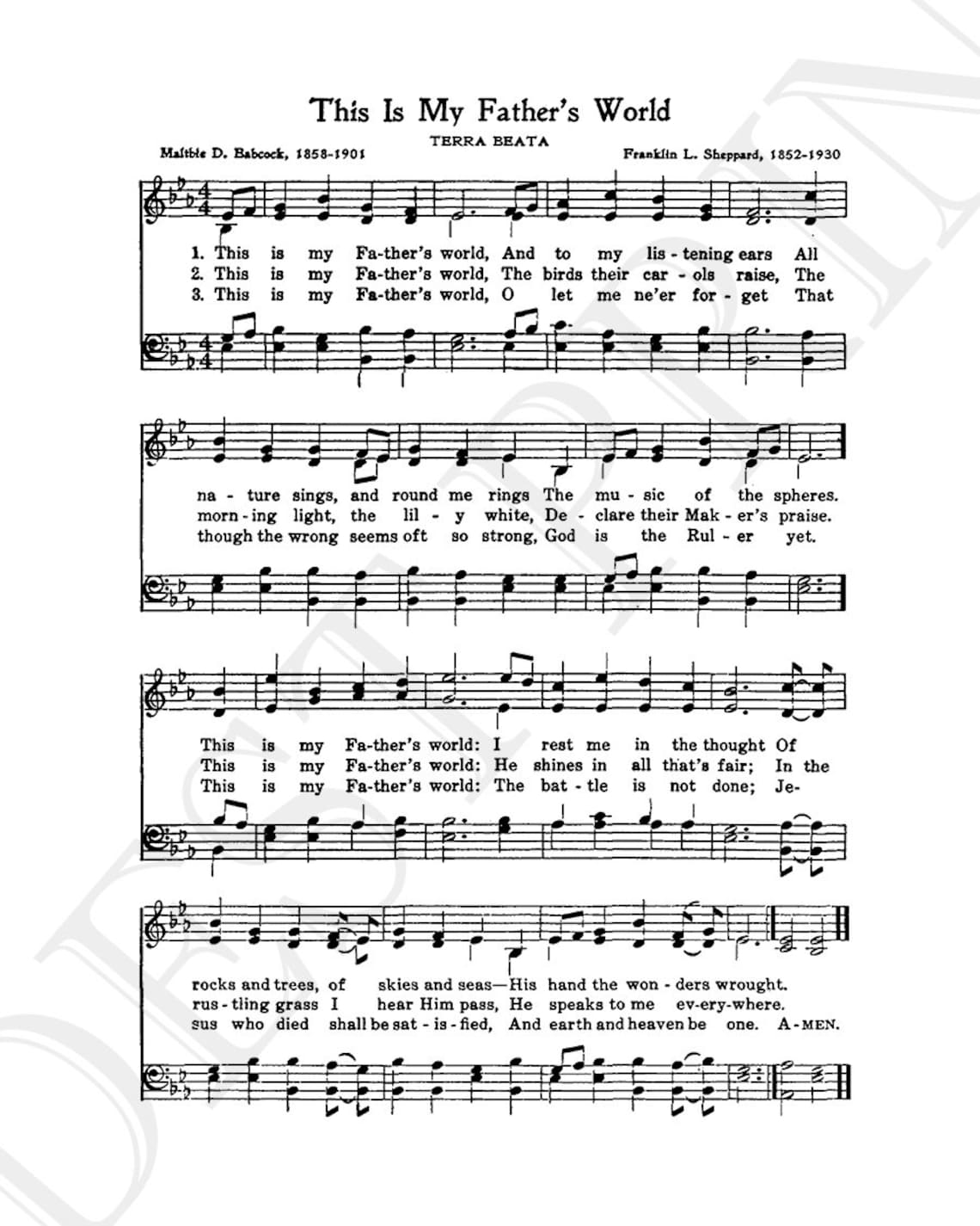 This is My Fathers World Digital Hymn Tune Sheet Music Key of E Flat
