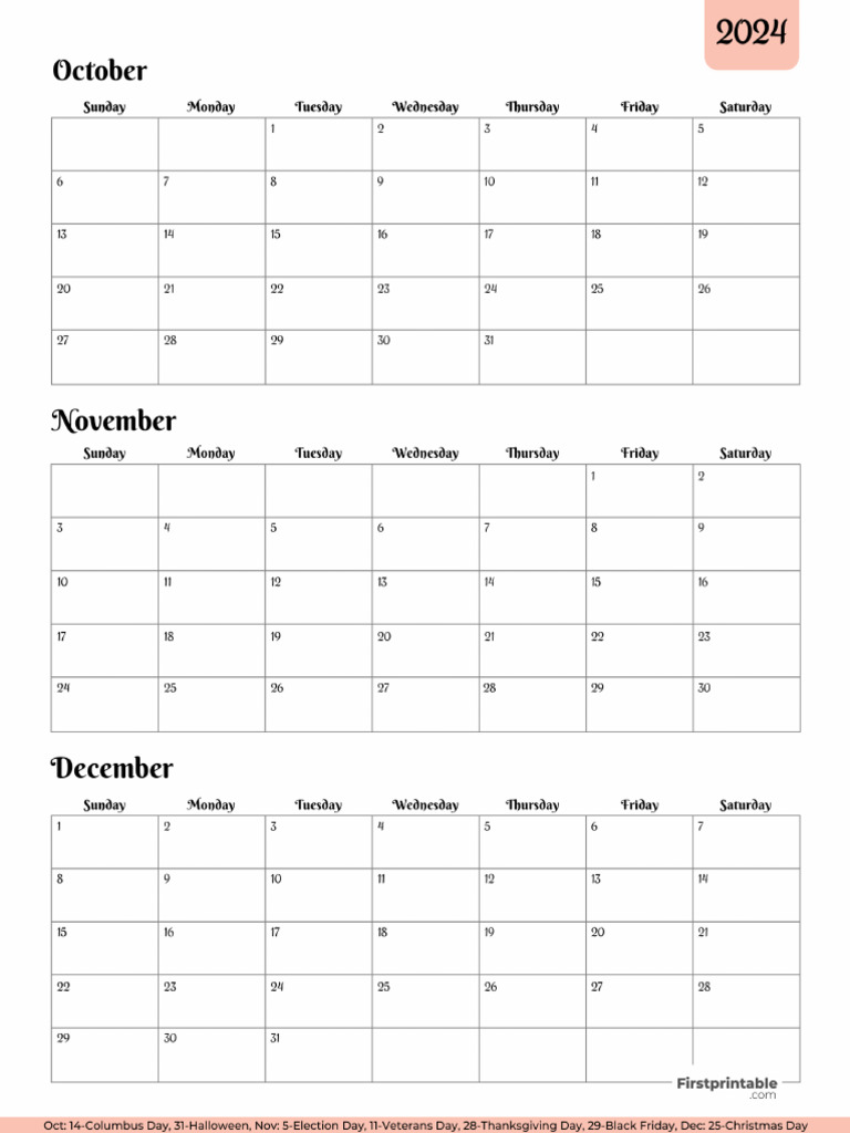 Three month Printable Calendar with holidays 2024 Q4 Template 03