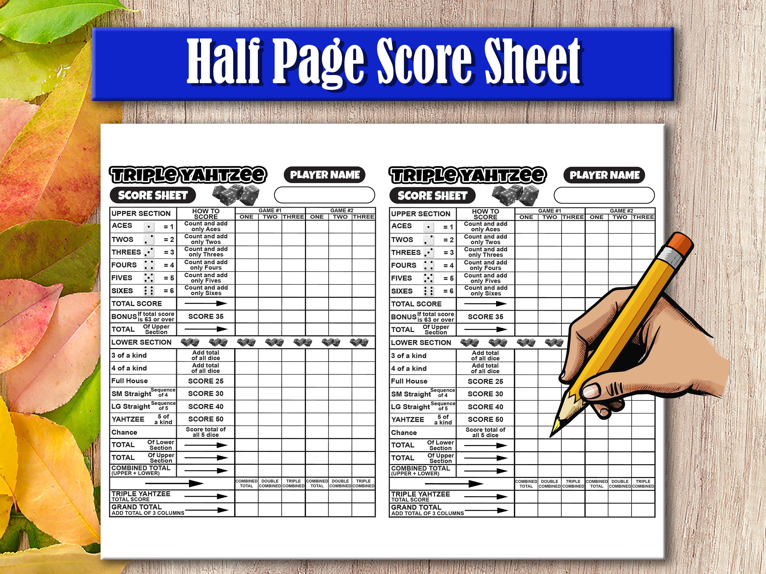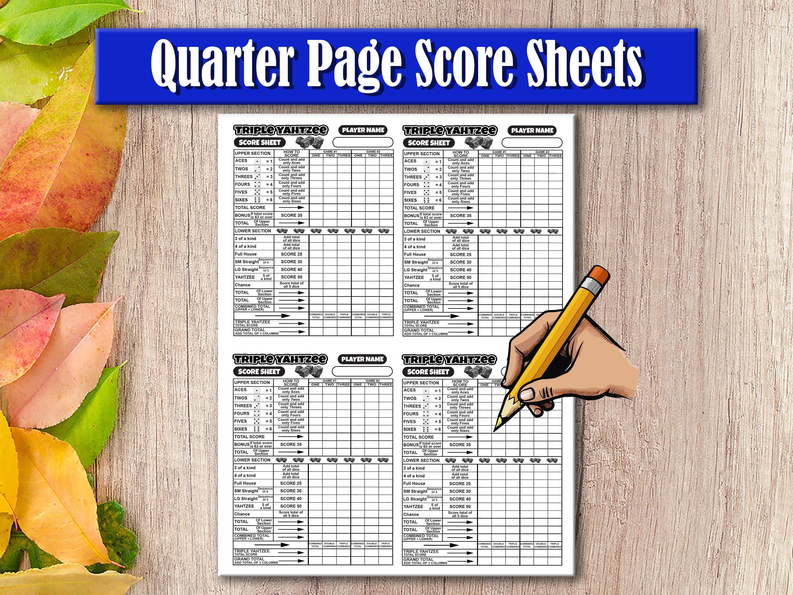 Triple Yahtzee Score Sheet Printable Large Score Card Pad Instant
