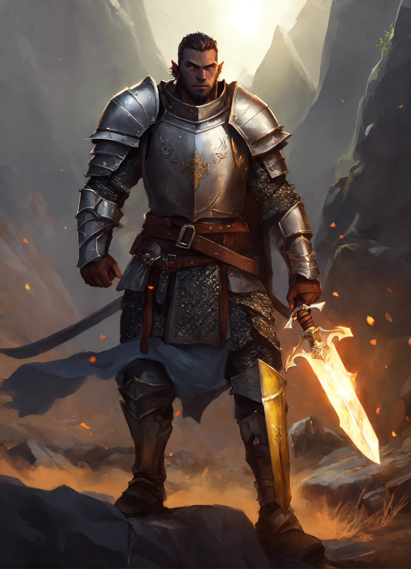 Lexica Half orc paladin male grey skin half plate armor holding a