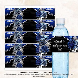 Blank Printable Water Bottle Label Royal Blue Silver Roses Glitter
