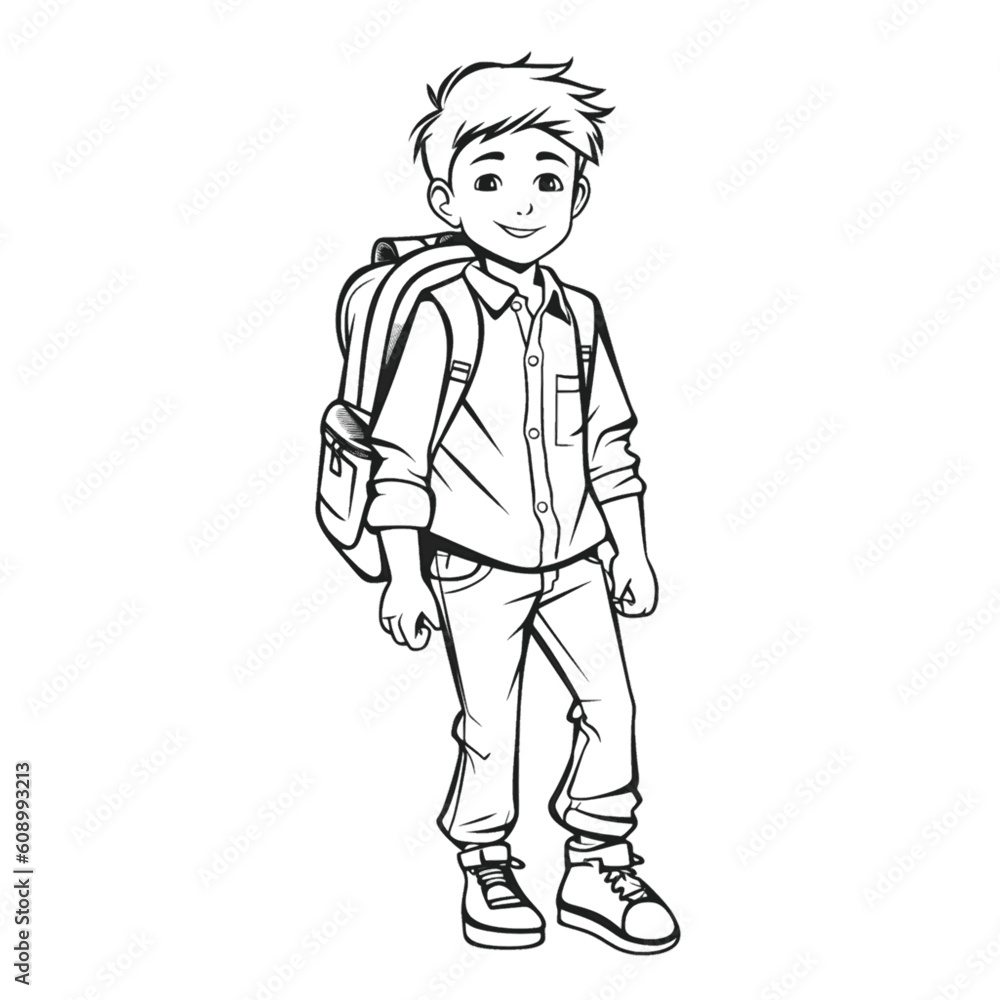 Handsome Outline Coloring Page: Full Body Shot of a School Boy for Kids