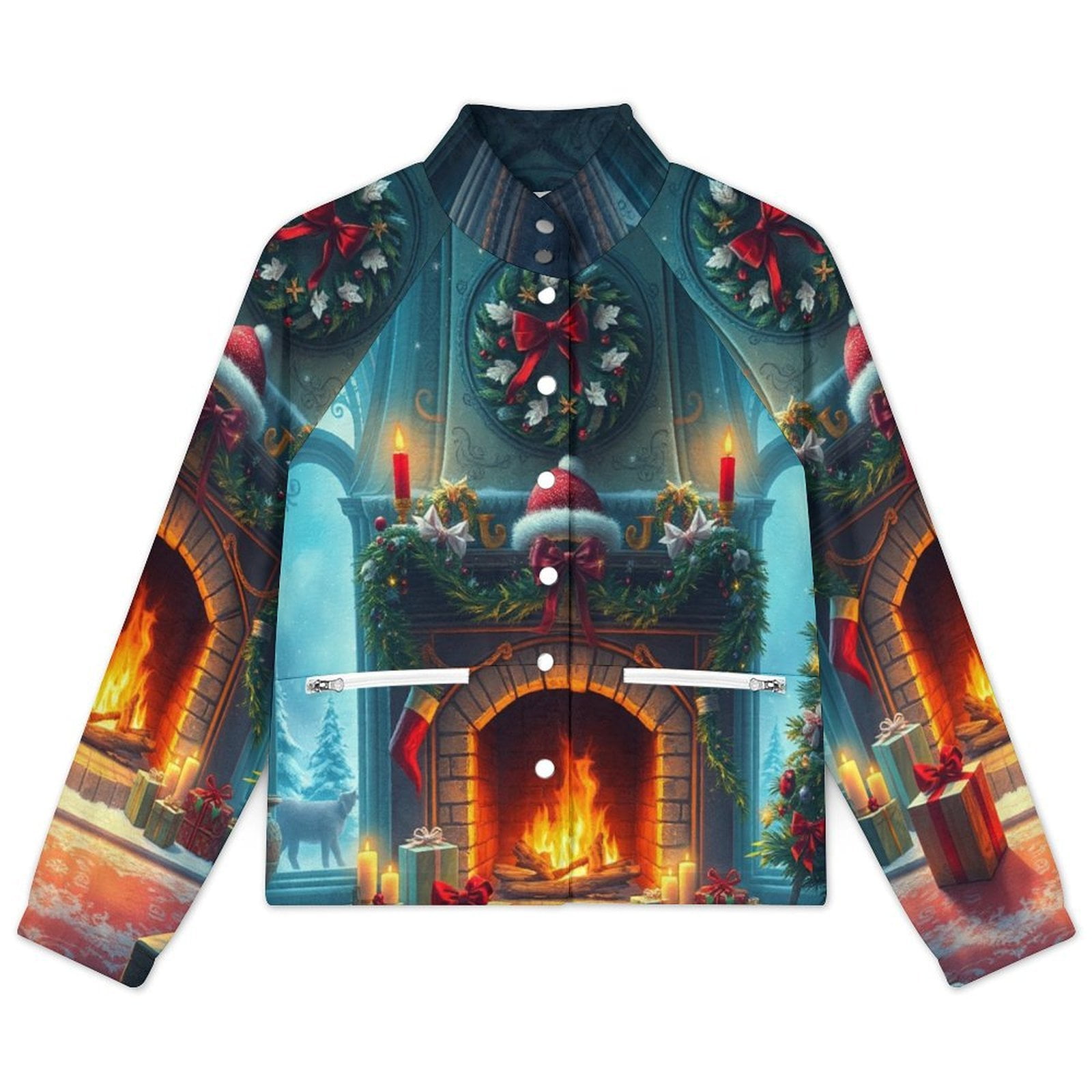 Christmas Fireplace Scene Fall Winter Women Jacket Stand Collar Thick
